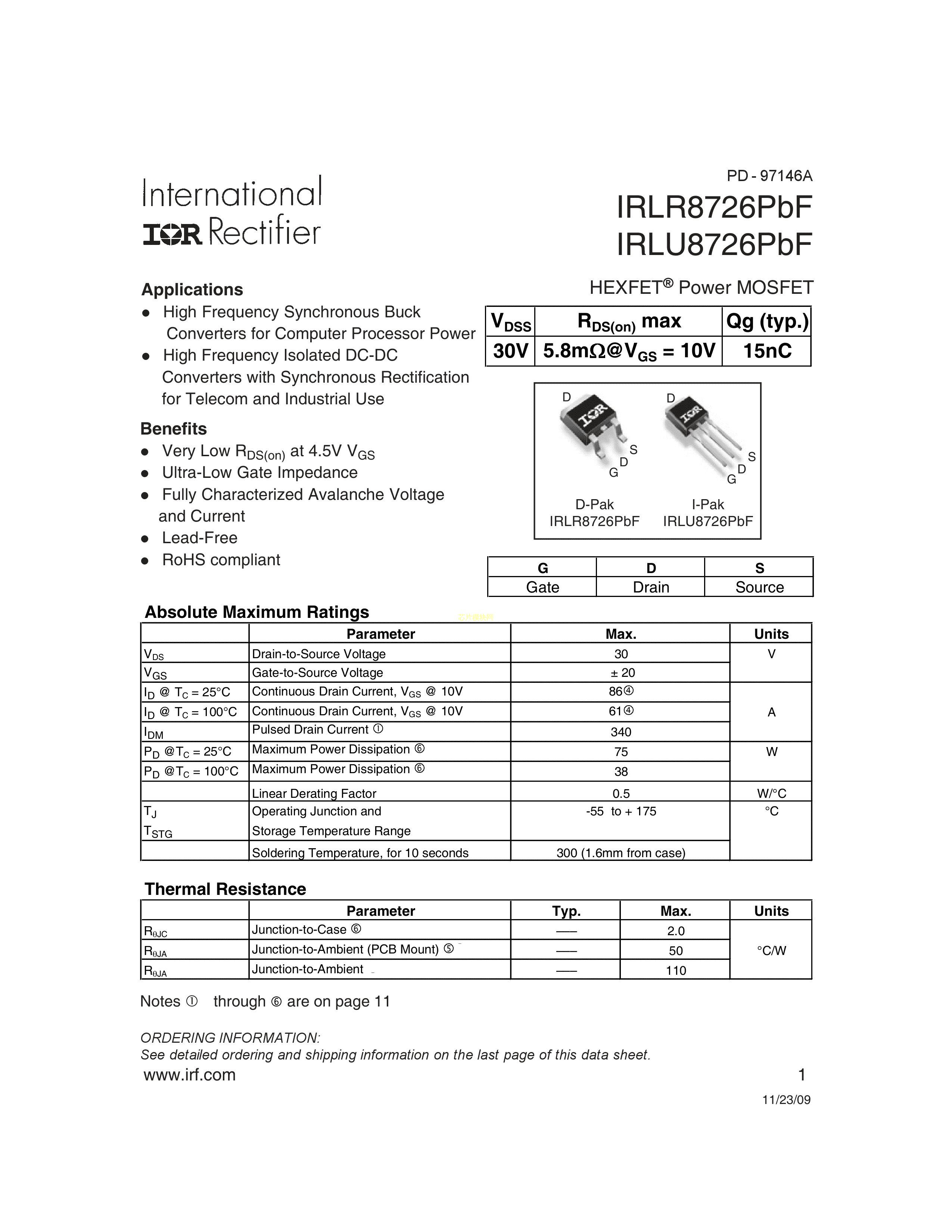 IRLR8726TRPBF数据手册TO-252-2(DPAK)封装Infineon(英飞凌)PDF规