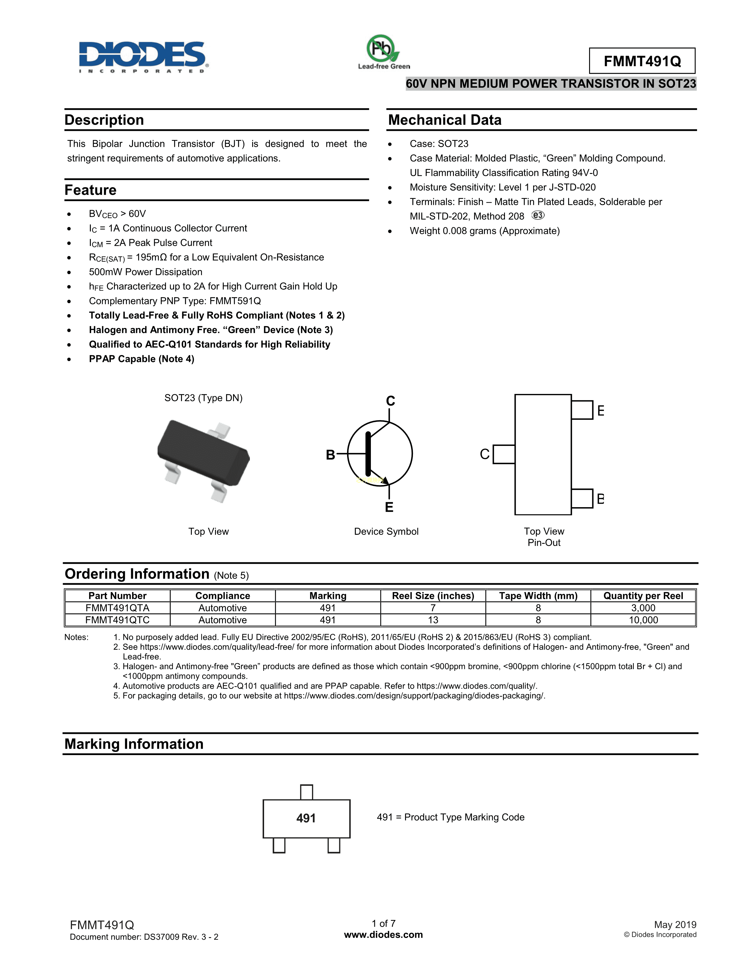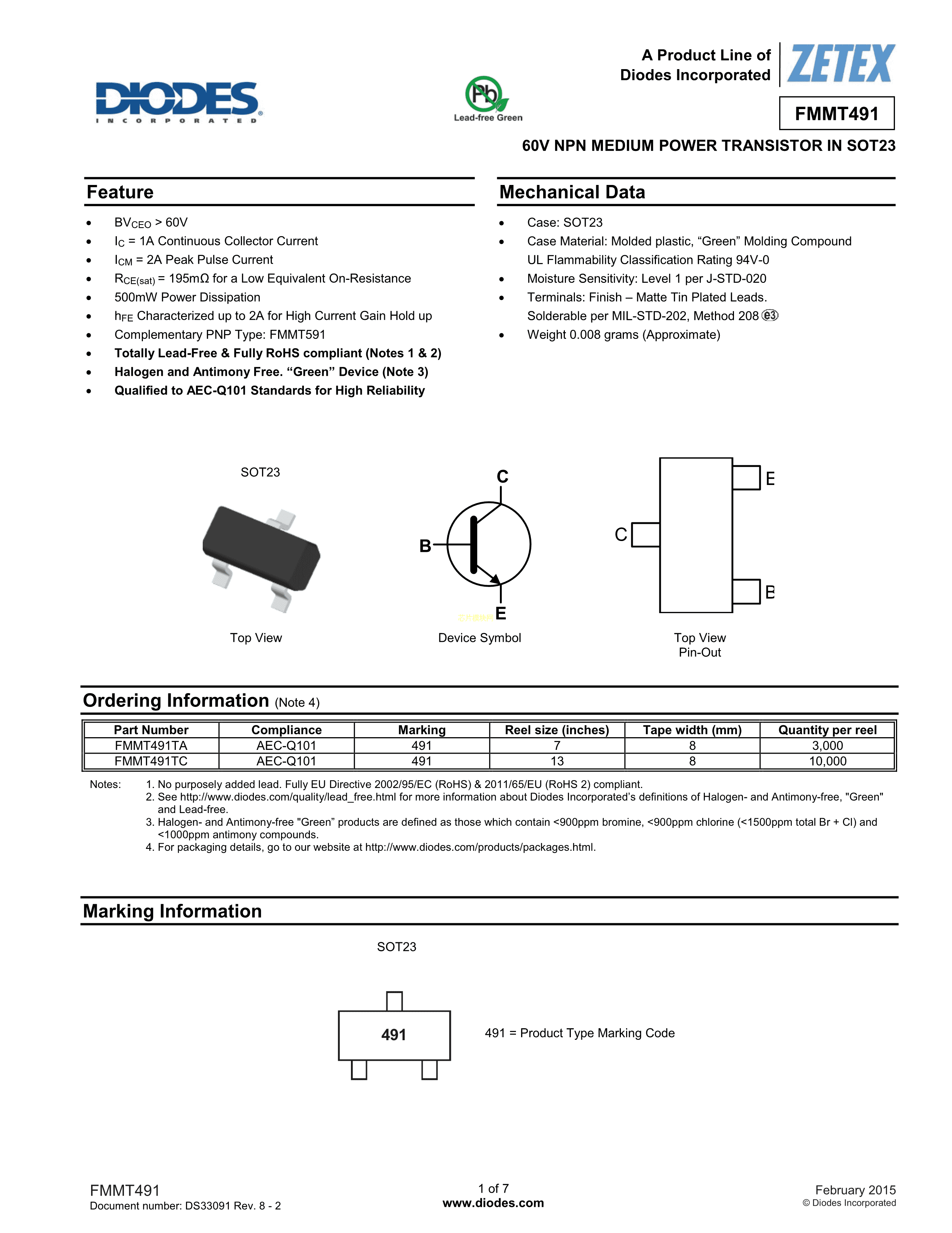FMMT491QTA数据手册SOT-23封装DIODES(美台)PDF规格书,中英文下载
