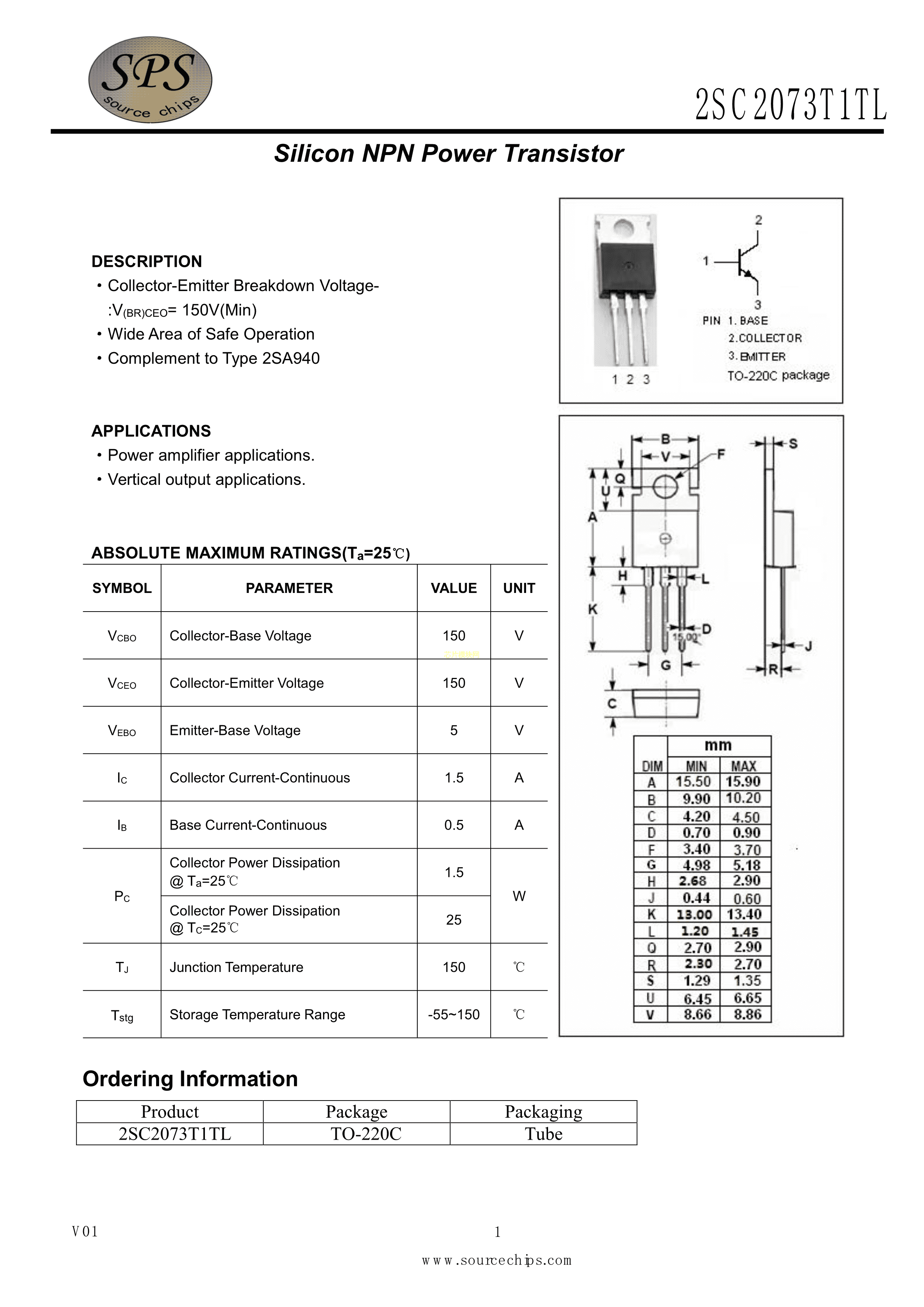 2SC2073T1TL数据手册TO-220C封装SPS(美国源芯)PDF规格书,中英文下载