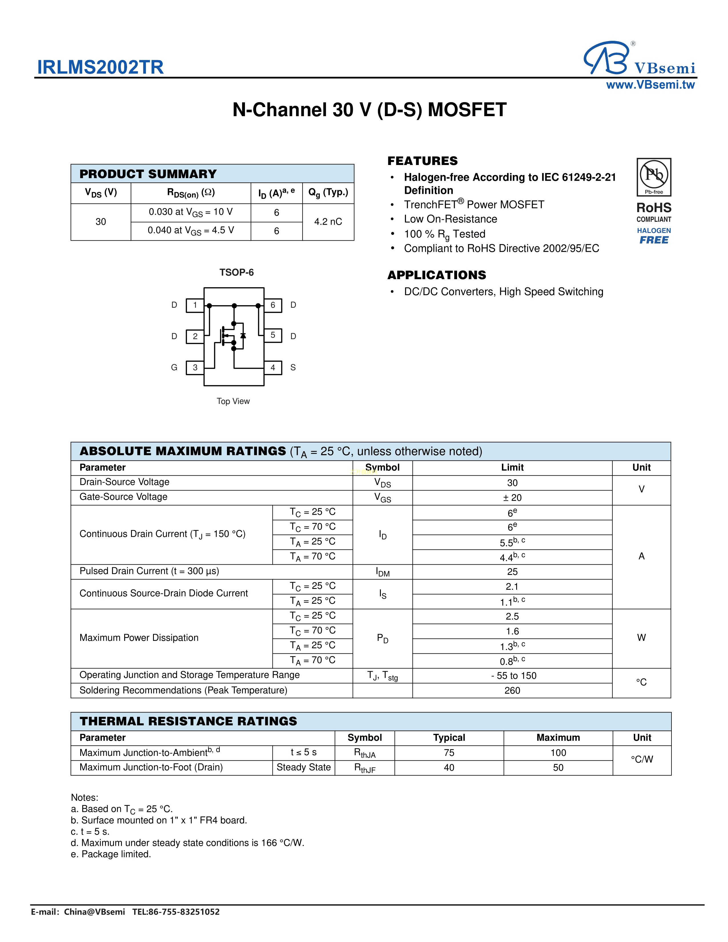 IRLMS2002TR数据手册TSOP-6封装VBsemi(台湾微碧)PDF规格书,中英文下载