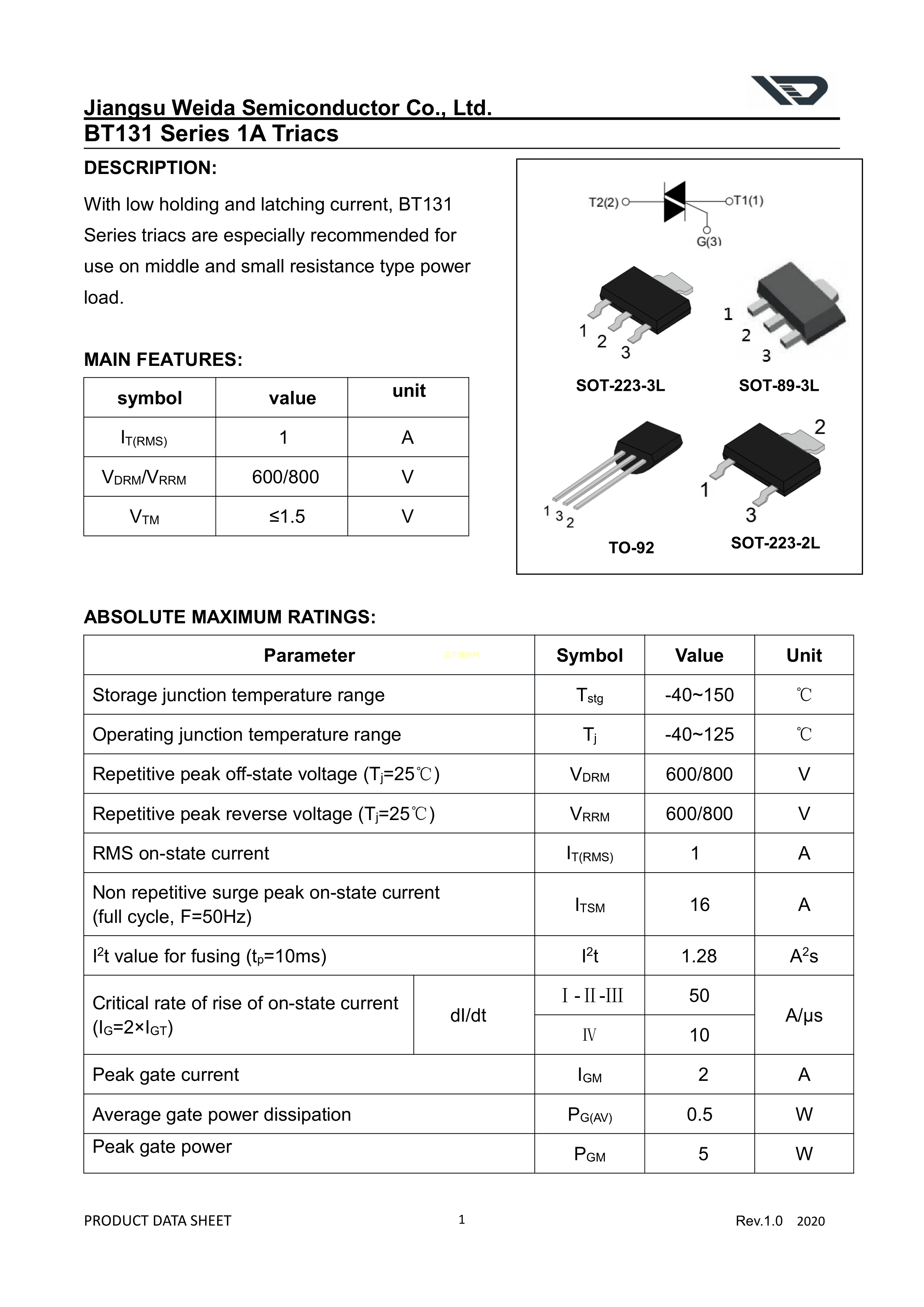 BT131-600T数据手册TO-92封装WEIDA(韦达)PDF规格书,中英文下载
