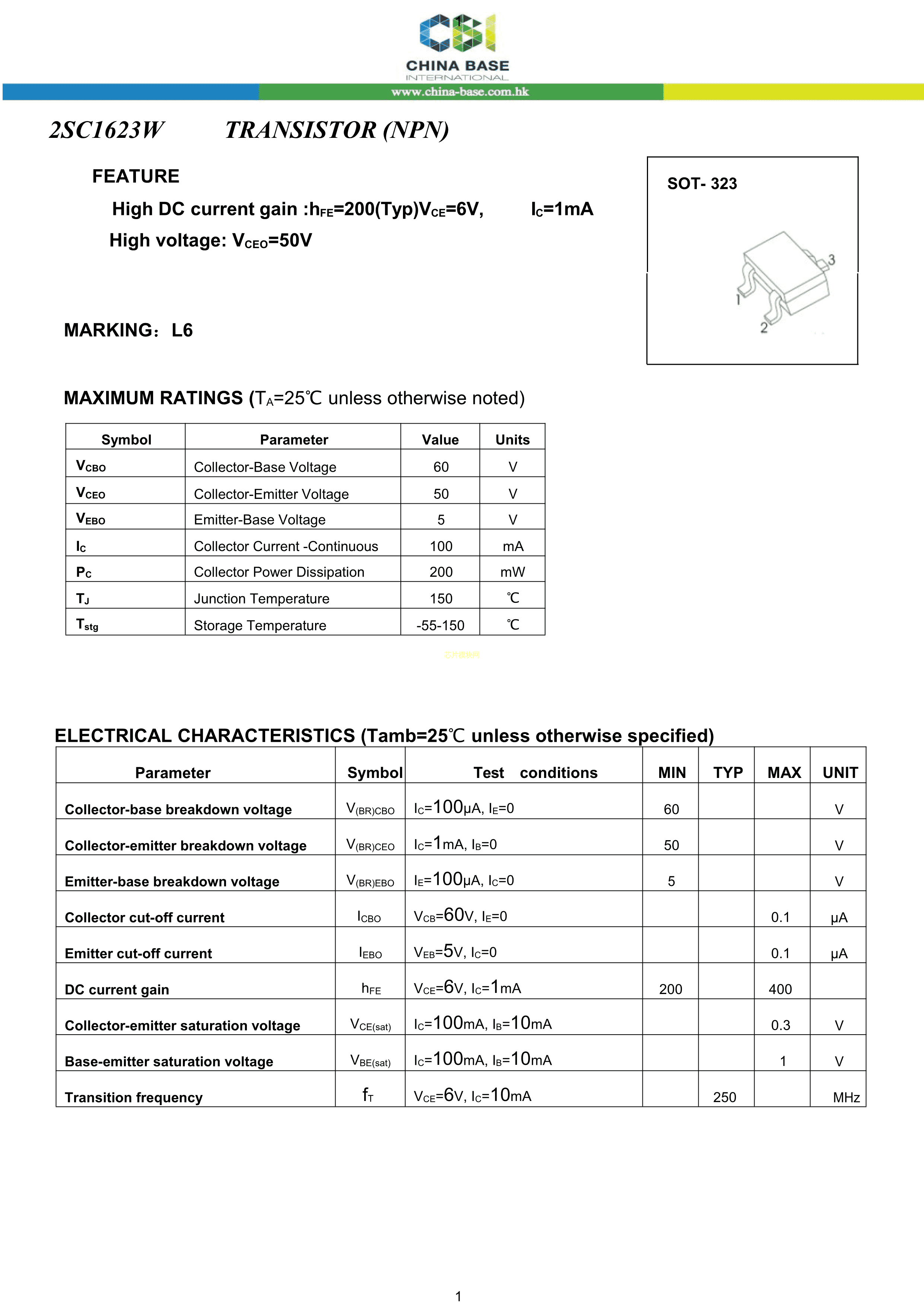 2SC1623W L6数据手册SOT-323封装CBI(创基)PDF规格书,中英文下载