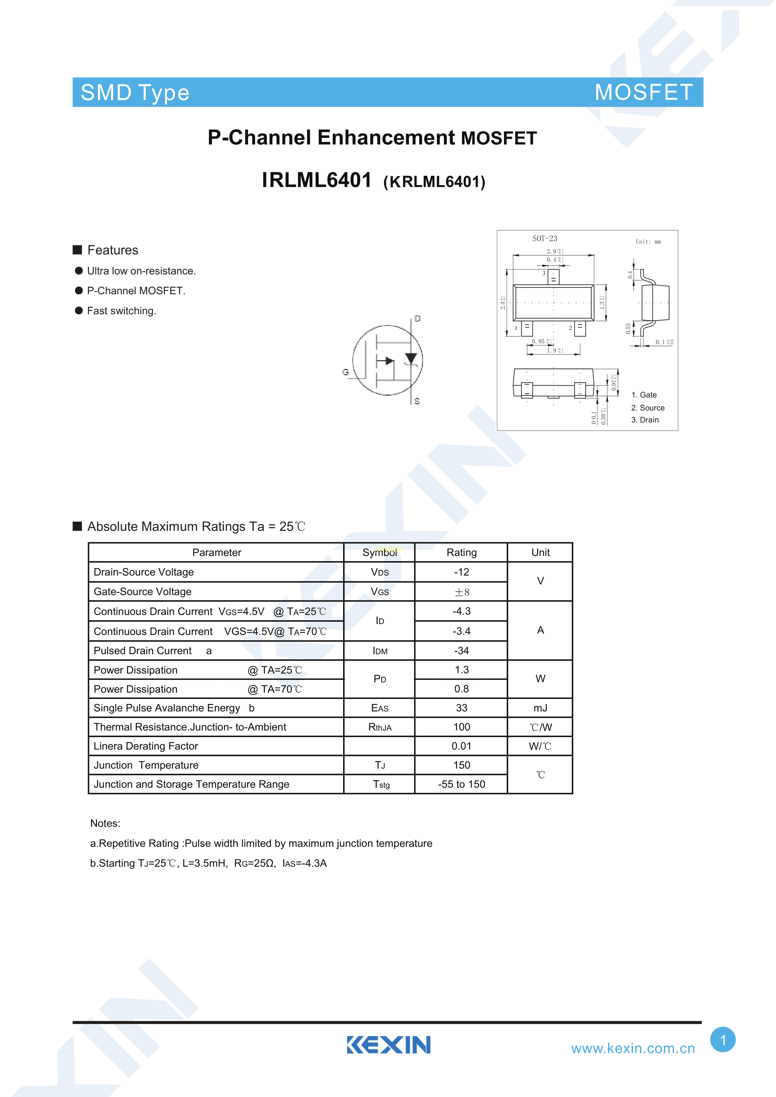IRLML6401数据手册SOT-23封装KEXIN(科信)PDF规格书,中英文下载