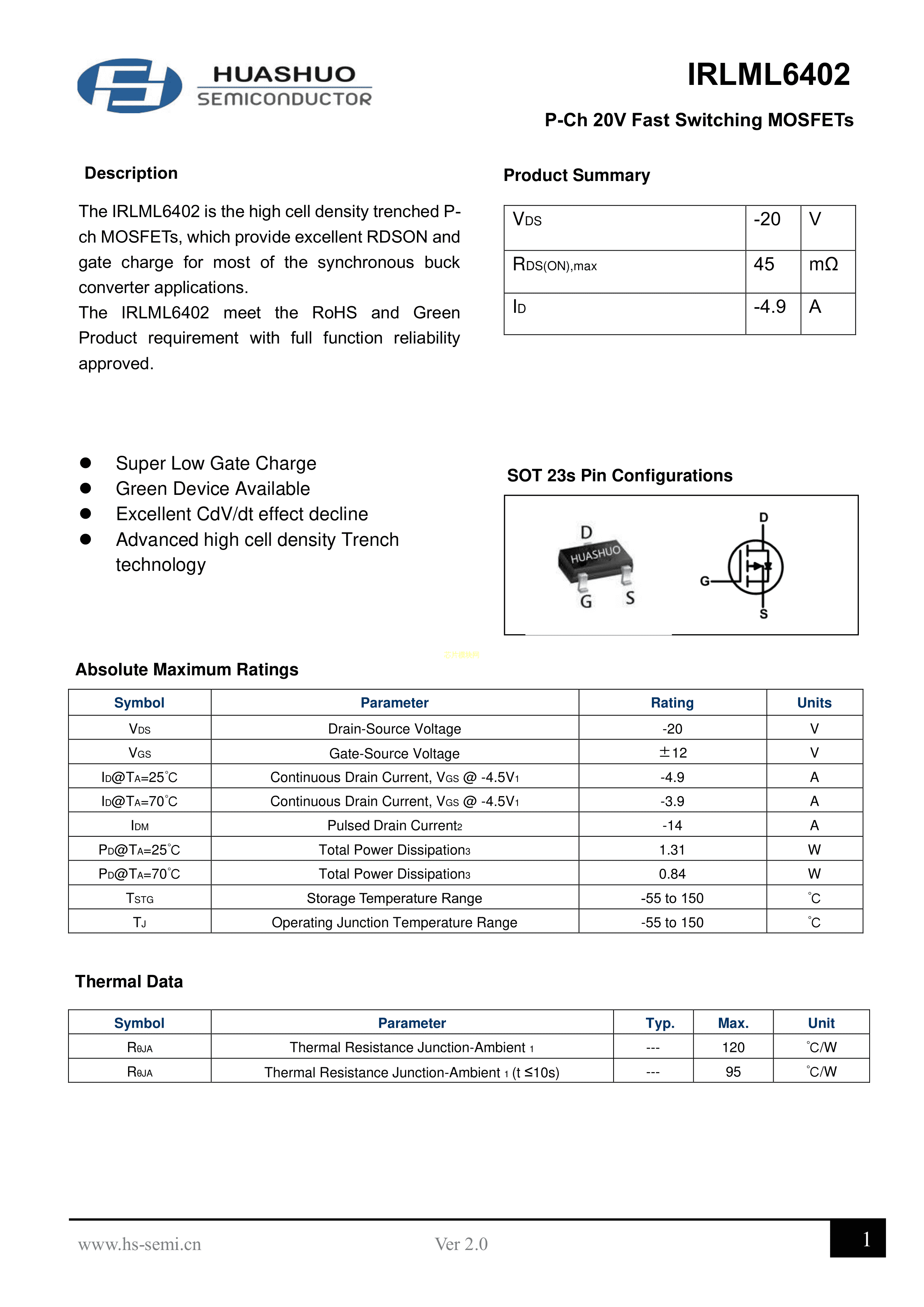 IRLML6402数据手册SOT-23-3封装HUASHUO(华朔)PDF规格书,中英文下载