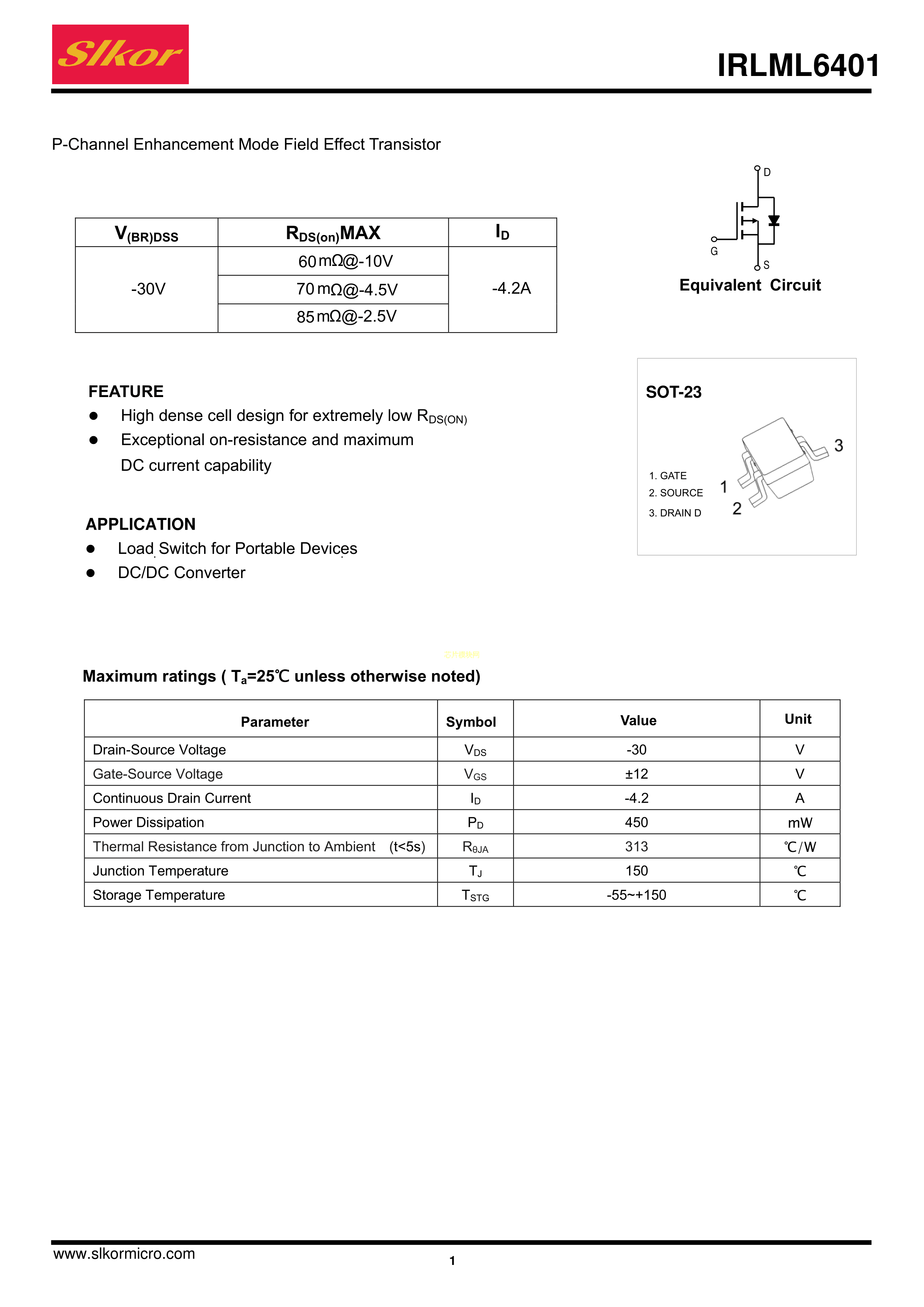 IRLML6401数据手册SOT-23封装Slkor(萨科微)PDF规格书,中英文下载