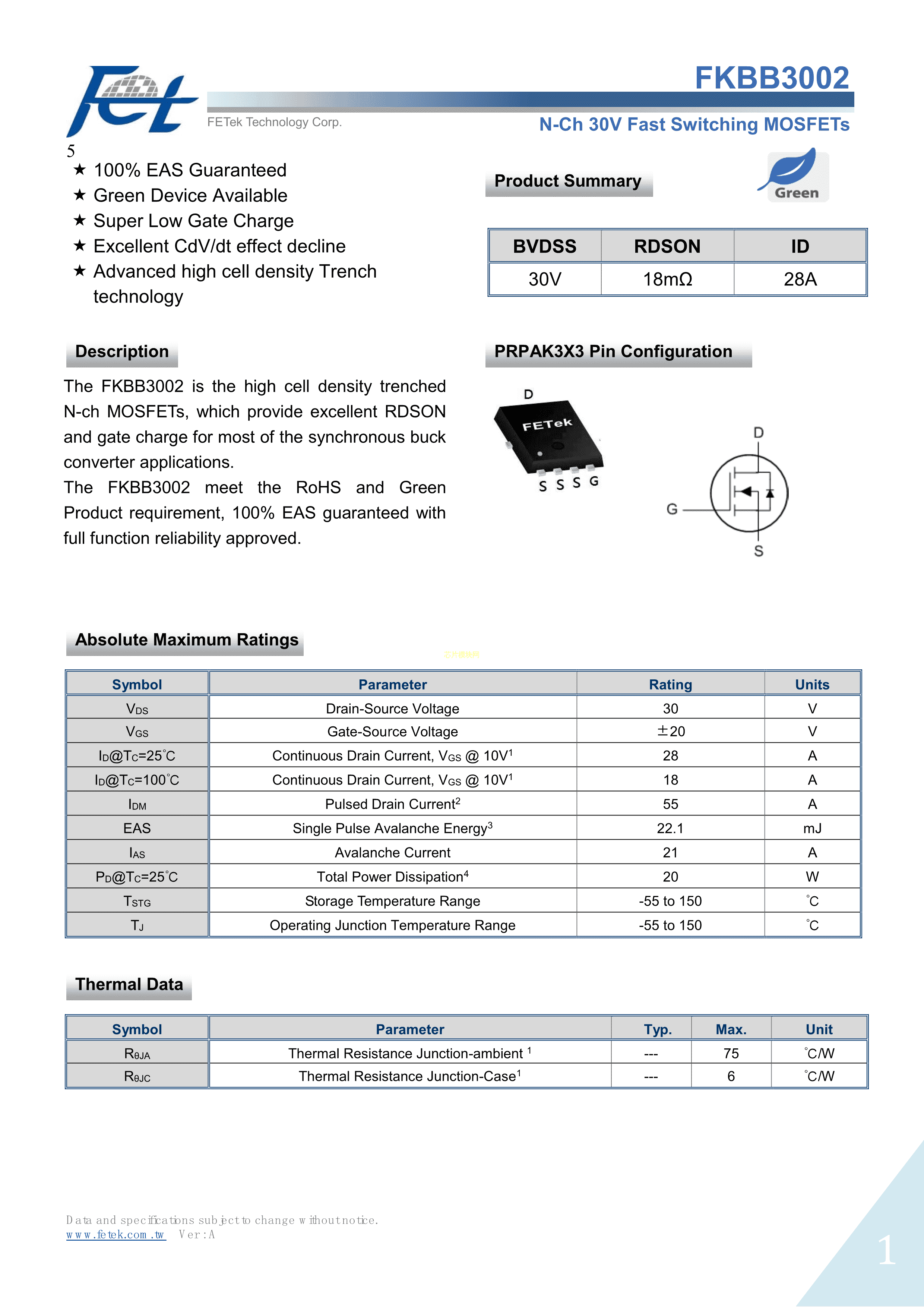 FKBB3002数据手册PRPAK3x3封装FETek(东沅)PDF规格书,中英文下载