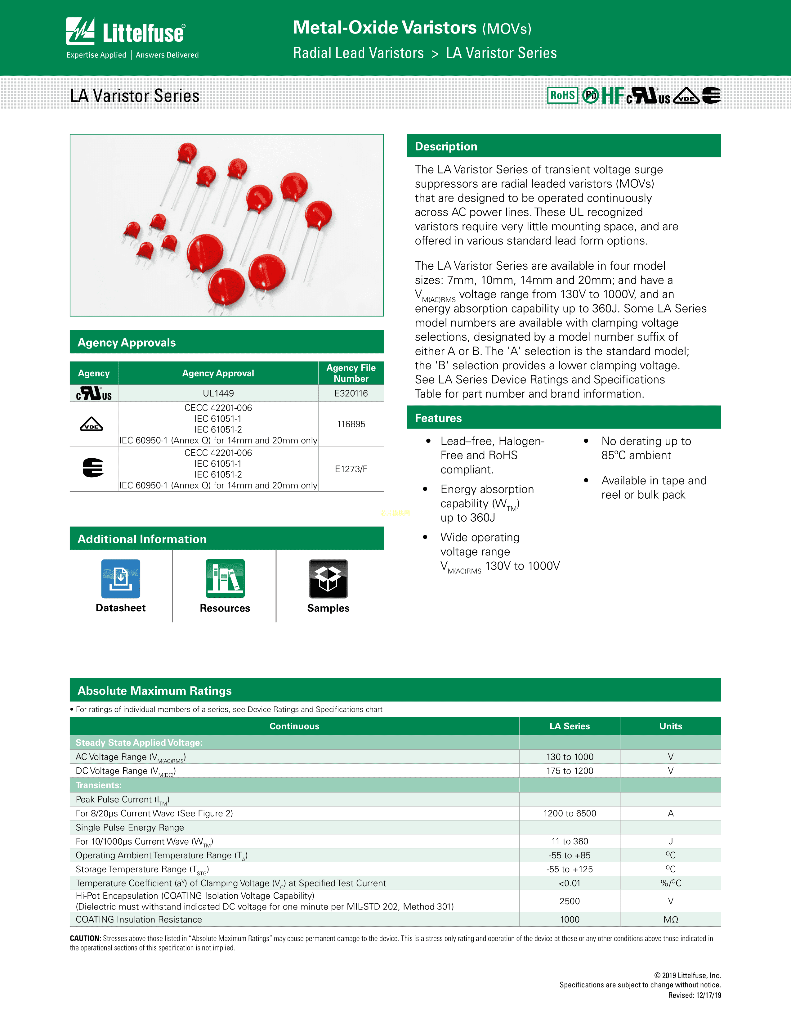V420LU40CPX10数据手册径向引线封装Littelfuse(美国力特)PDF规格书,中英文下
