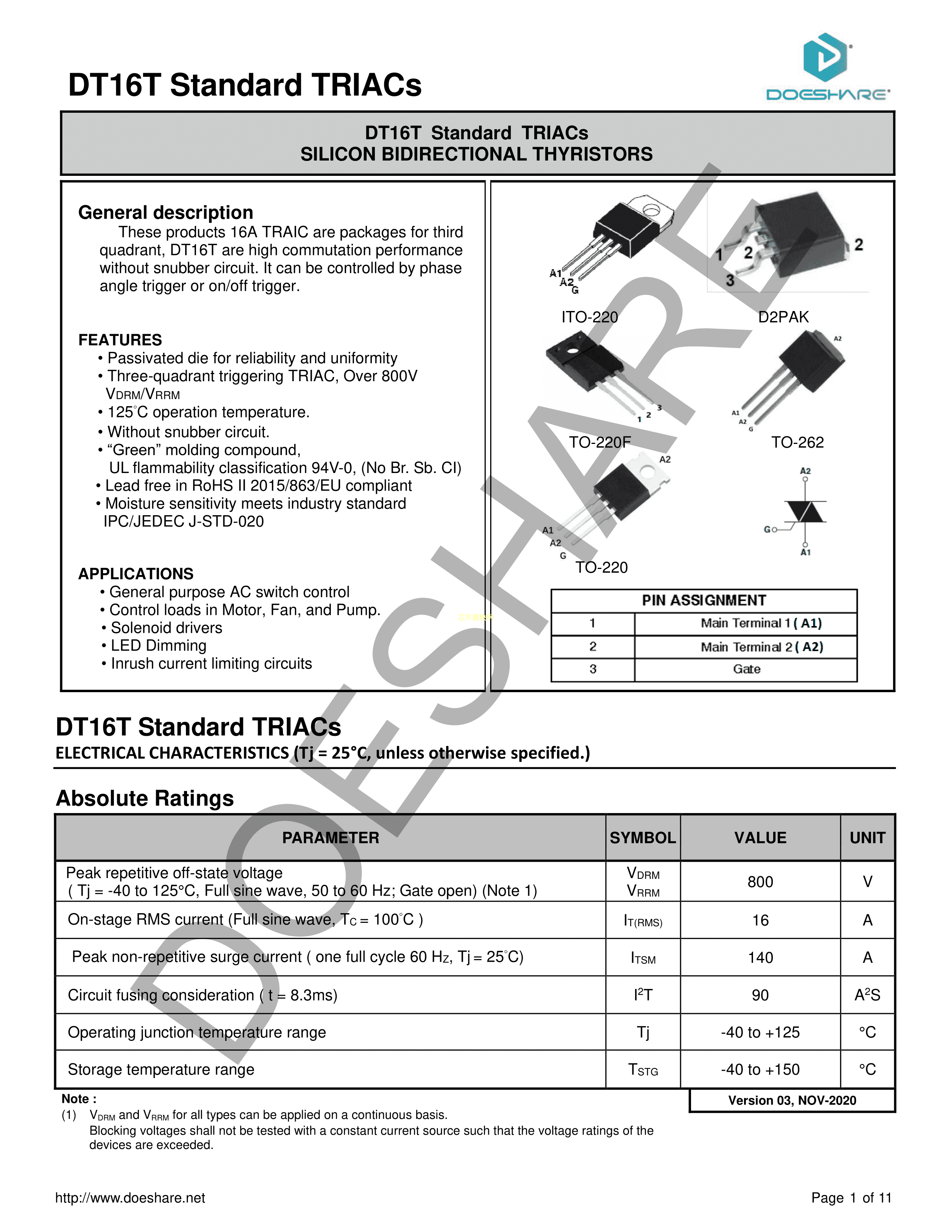 DT16T10T-B数据手册TO-220封装Doeshare(德芯)PDF规格书,中英文下载