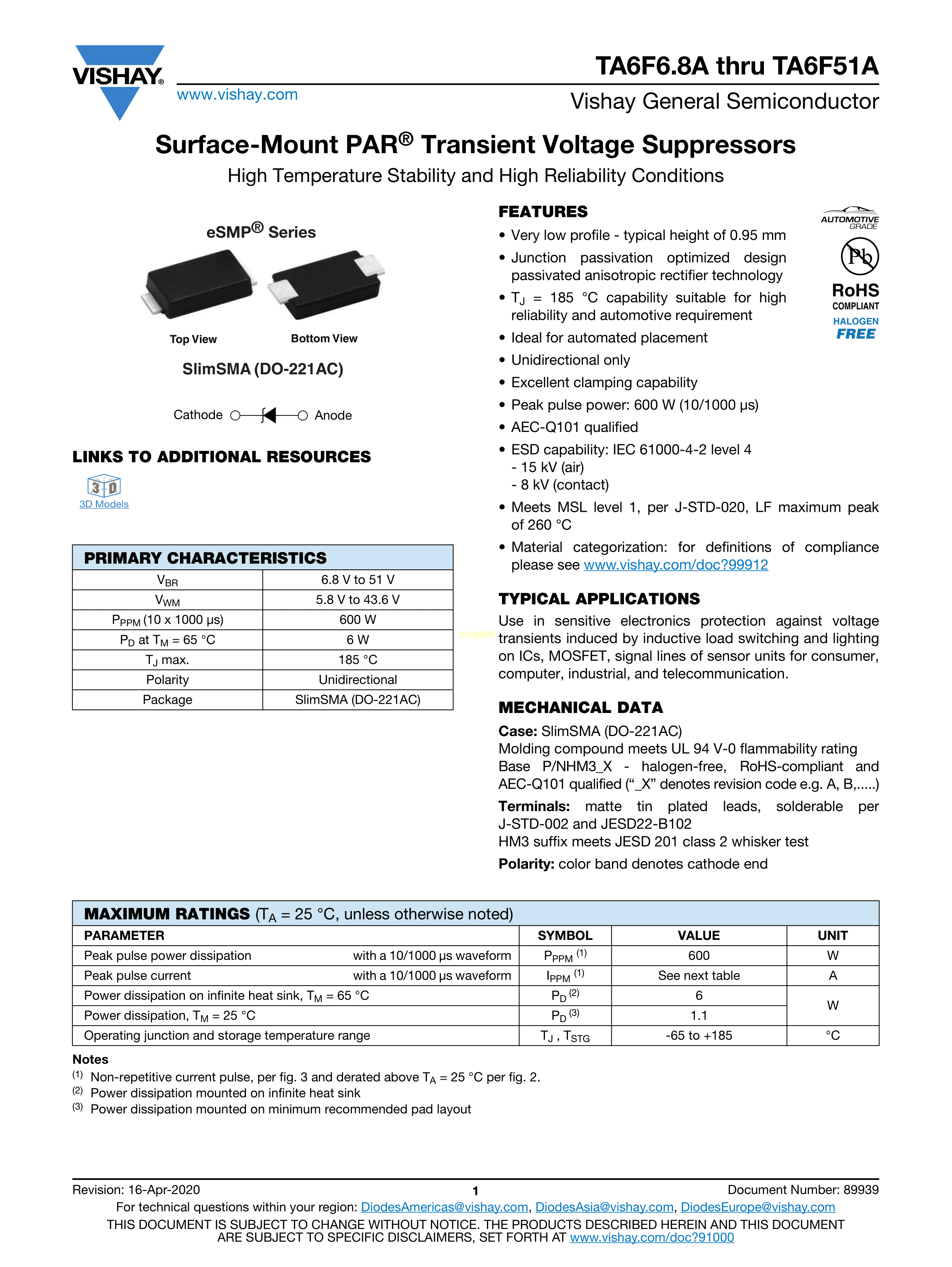 TA6F6.8AHM3_A-I数据手册DO-221AC(SlimSMA)封装VISHAY(威世)PD