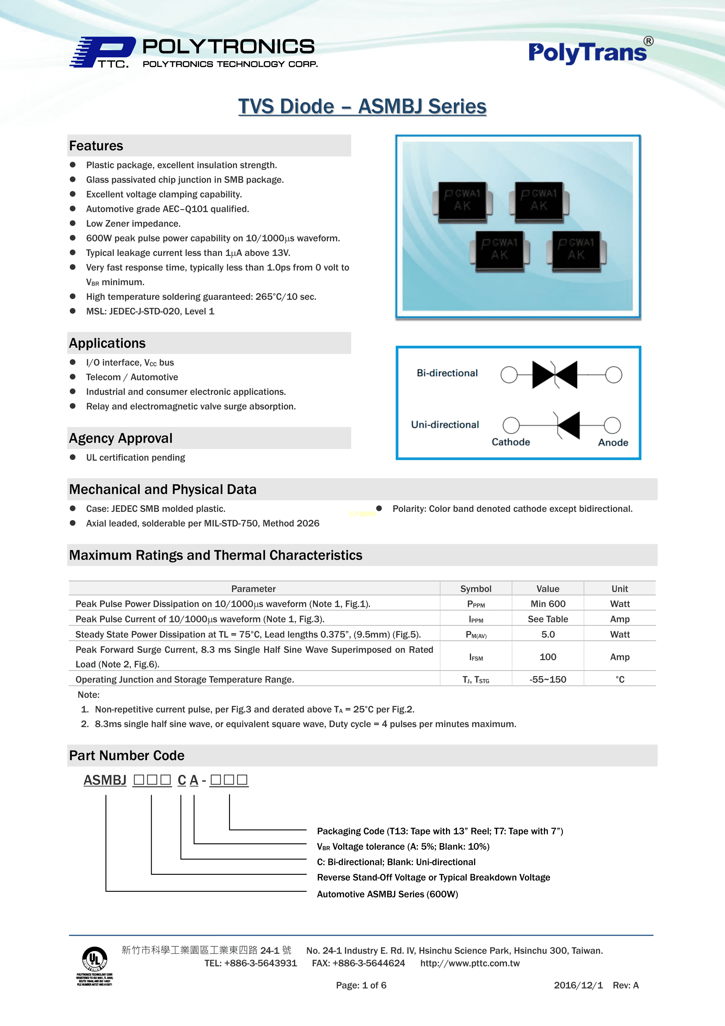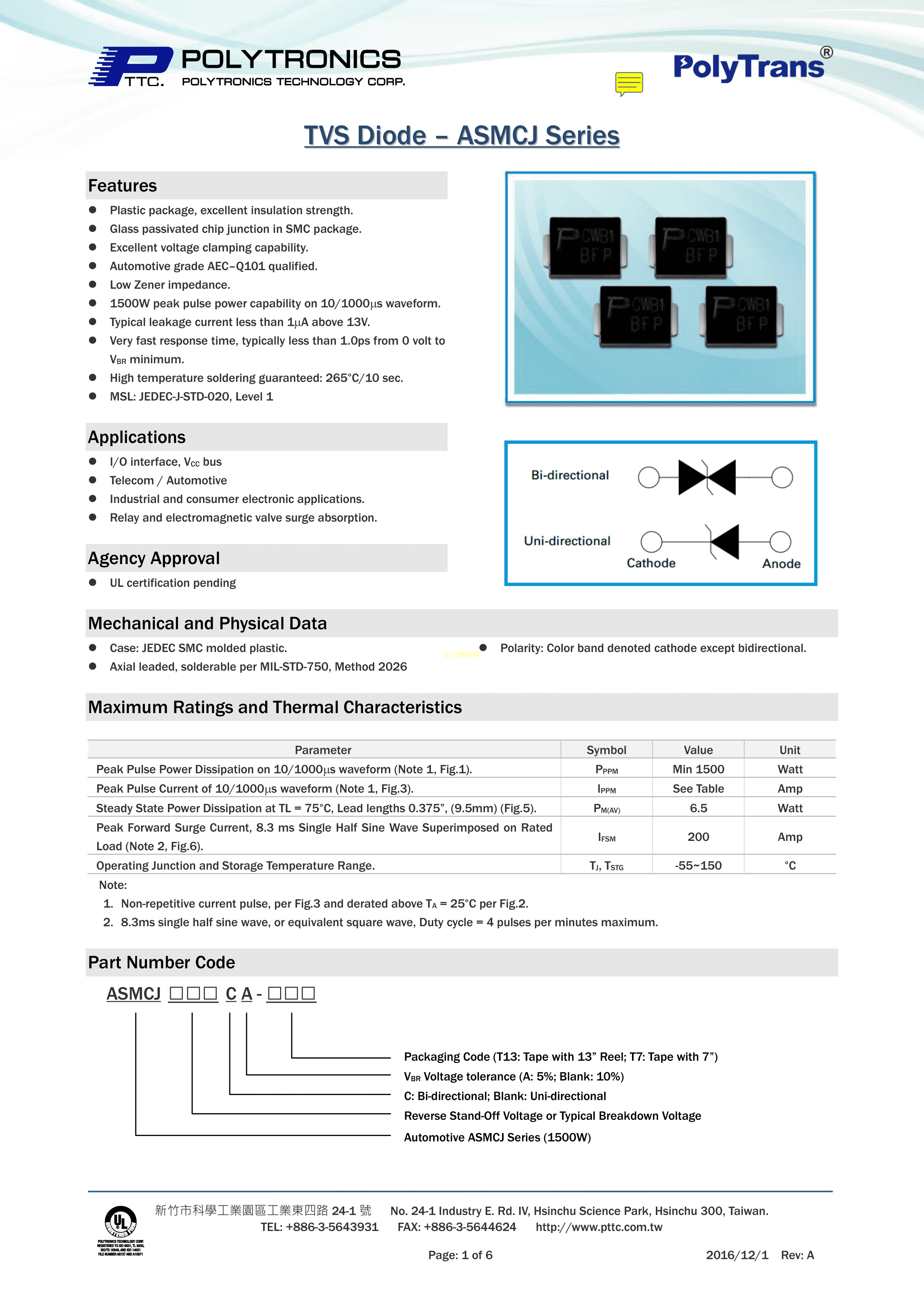 ASMBJ16CA数据手册SMB(DO-214AA)封装PTTC(聚鼎)PDF规格书,中英文下载
