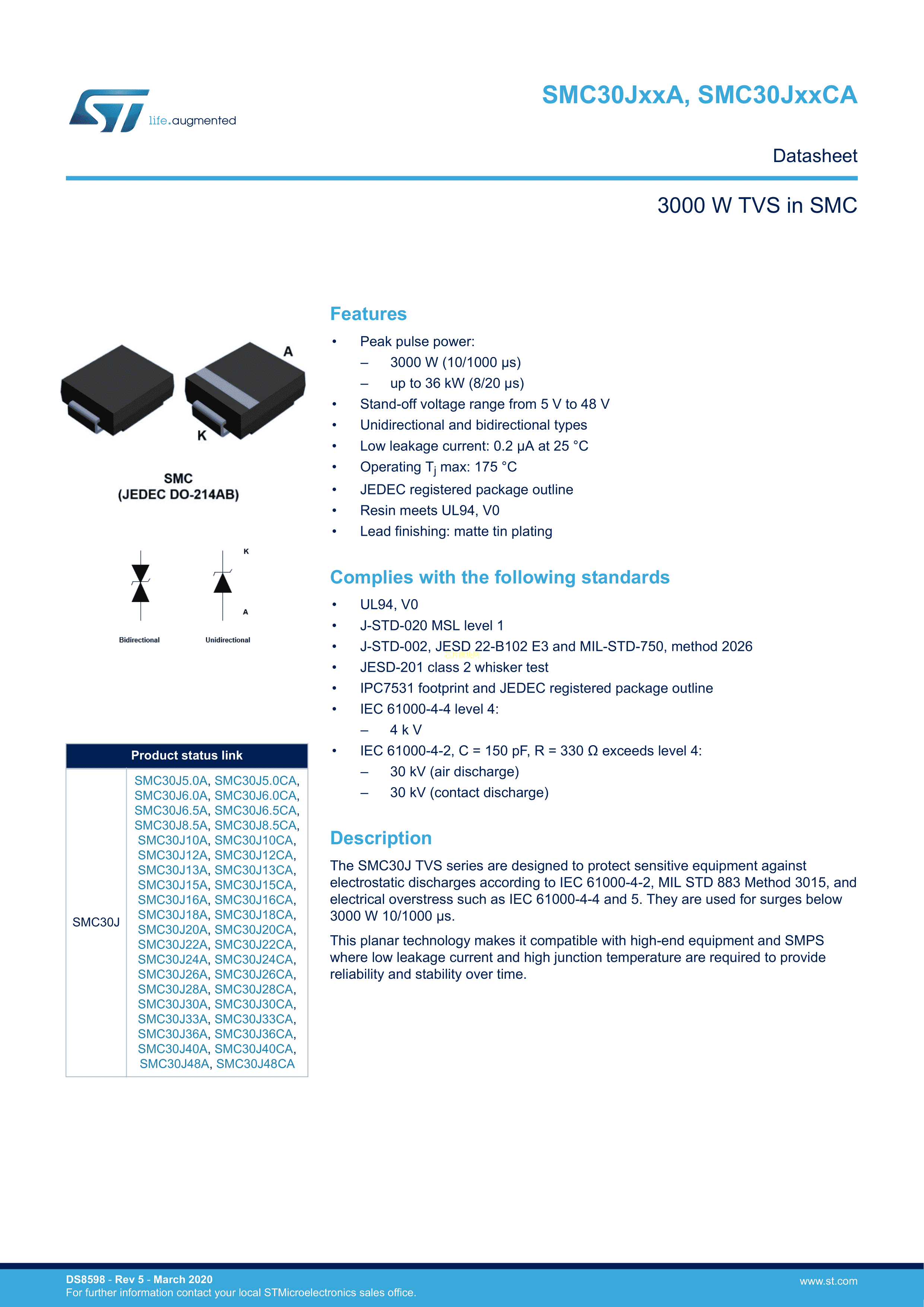 SMC30J33A数据手册SMC封装ST(意法半导体)PDF规格书,中英文下载