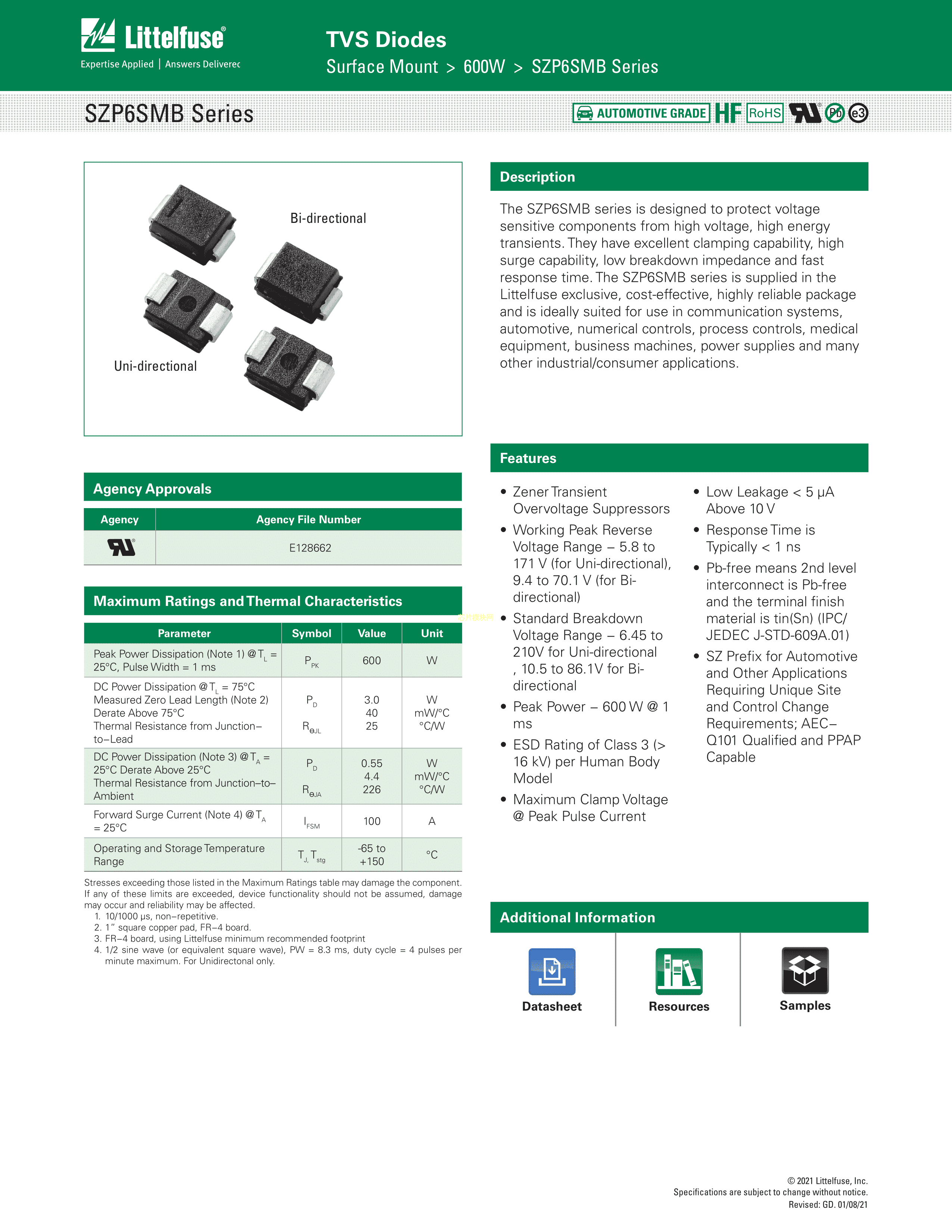 SZP6SMB82AT3G数据手册SMB封装Littelfuse(美国力特)PDF规格书,中英文下载