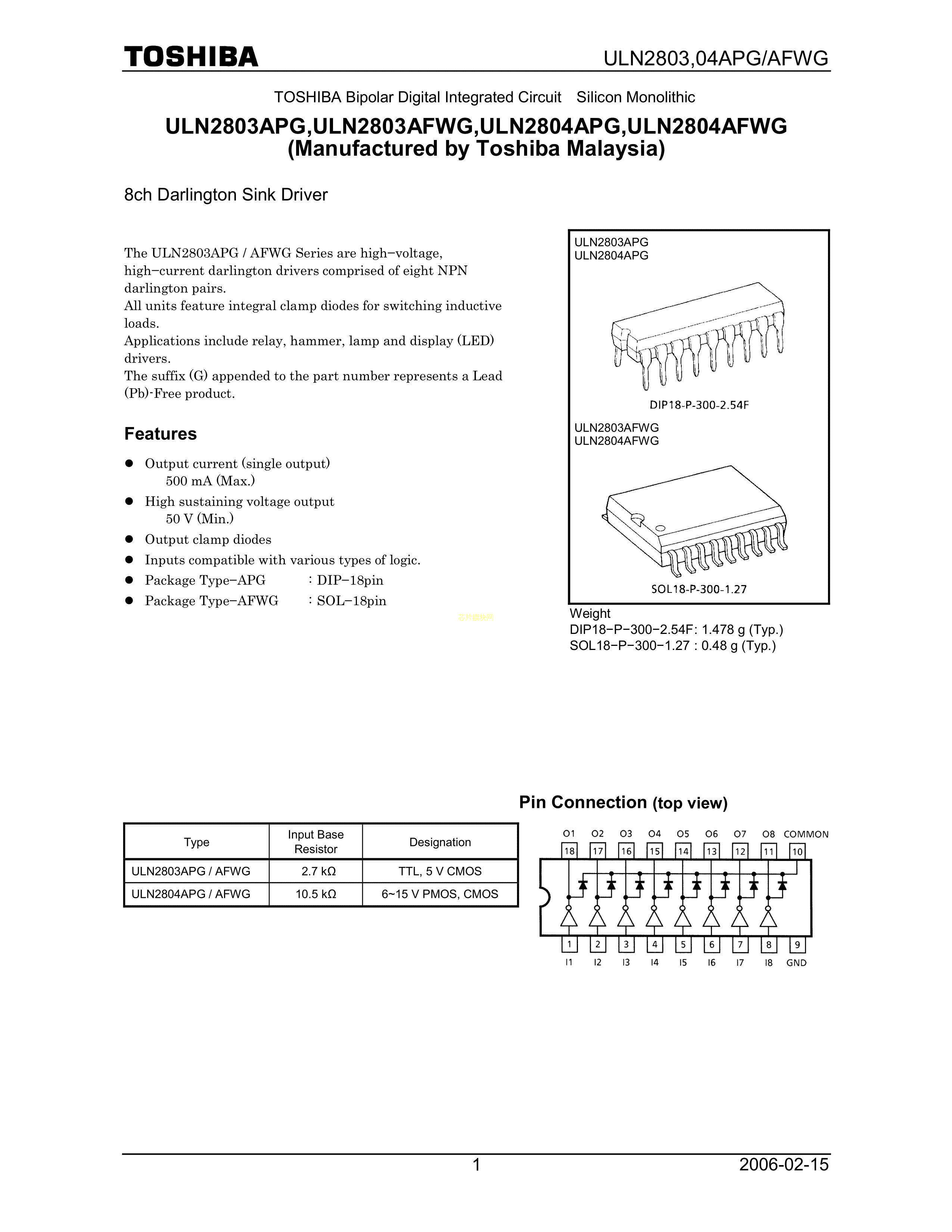 ULN2803AFWG数据手册SOIC-18_300mil封装TOSHIBA(东芝)PDF规格书,中英文下载