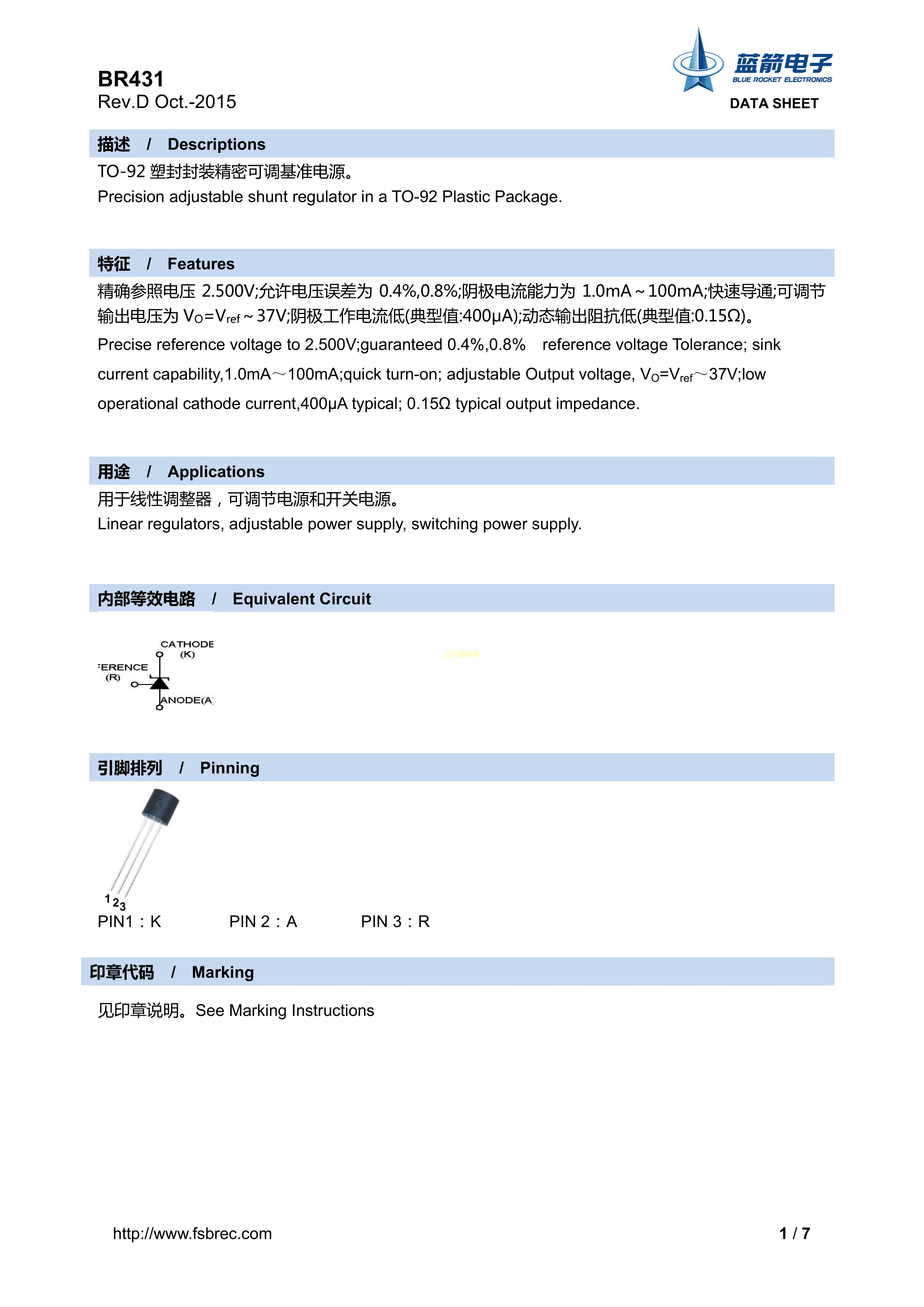 BR431-A数据手册TO-92封装BLUE ROCKET(蓝箭)PDF规格书,中英文下载