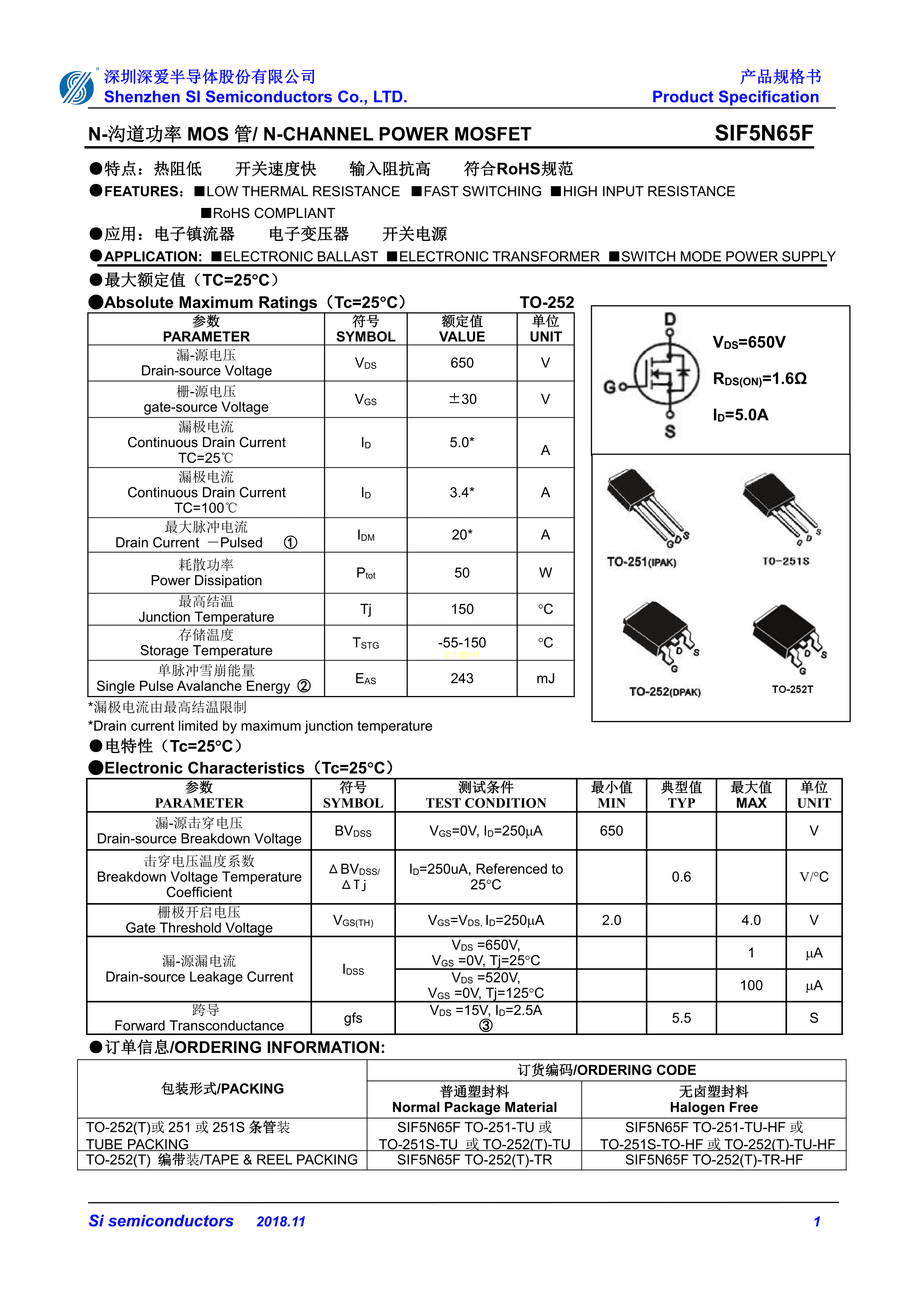 SIF5N65F-TO-252数据手册TO-252封装SI(深爱)PDF规格书,中英文下载