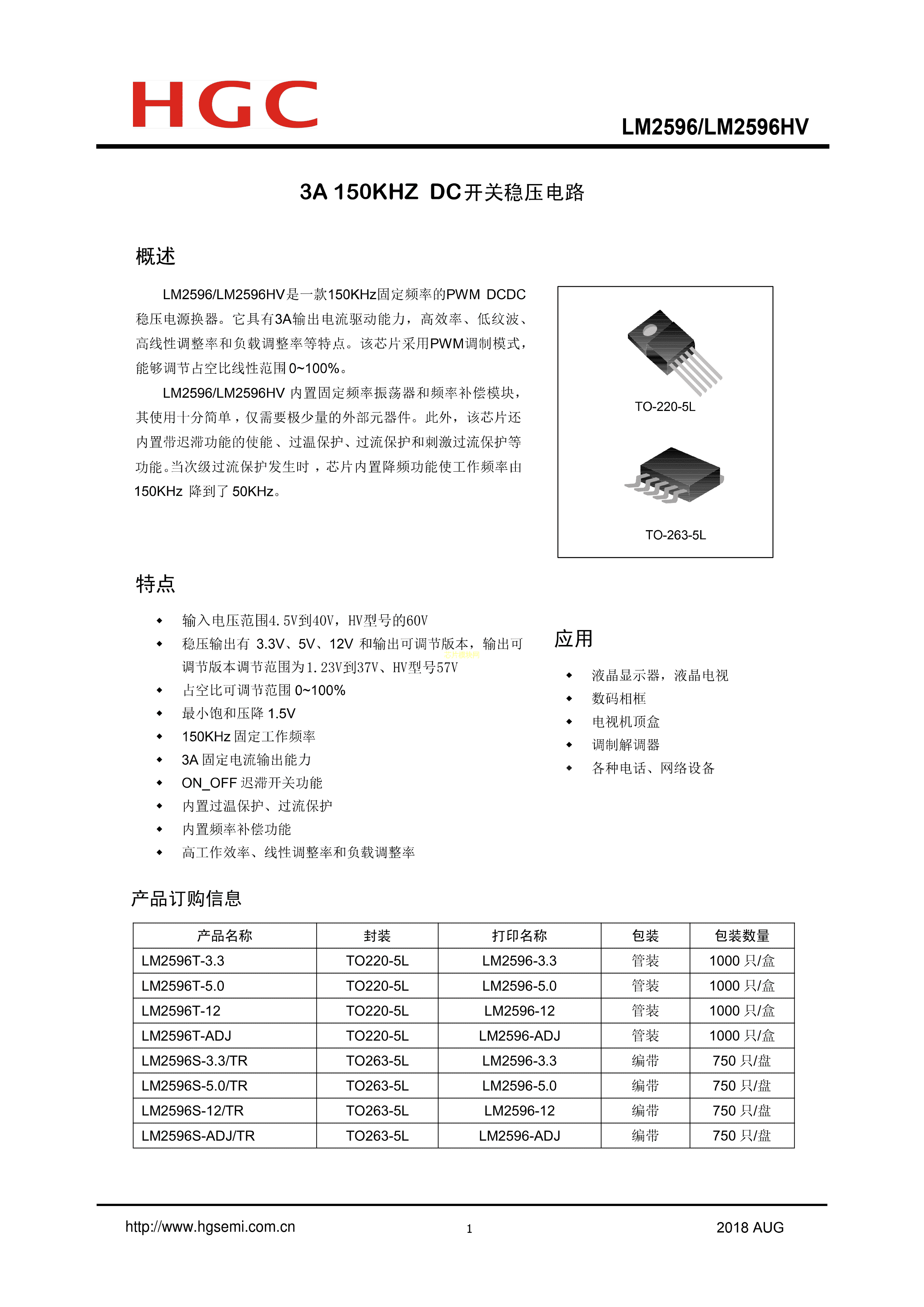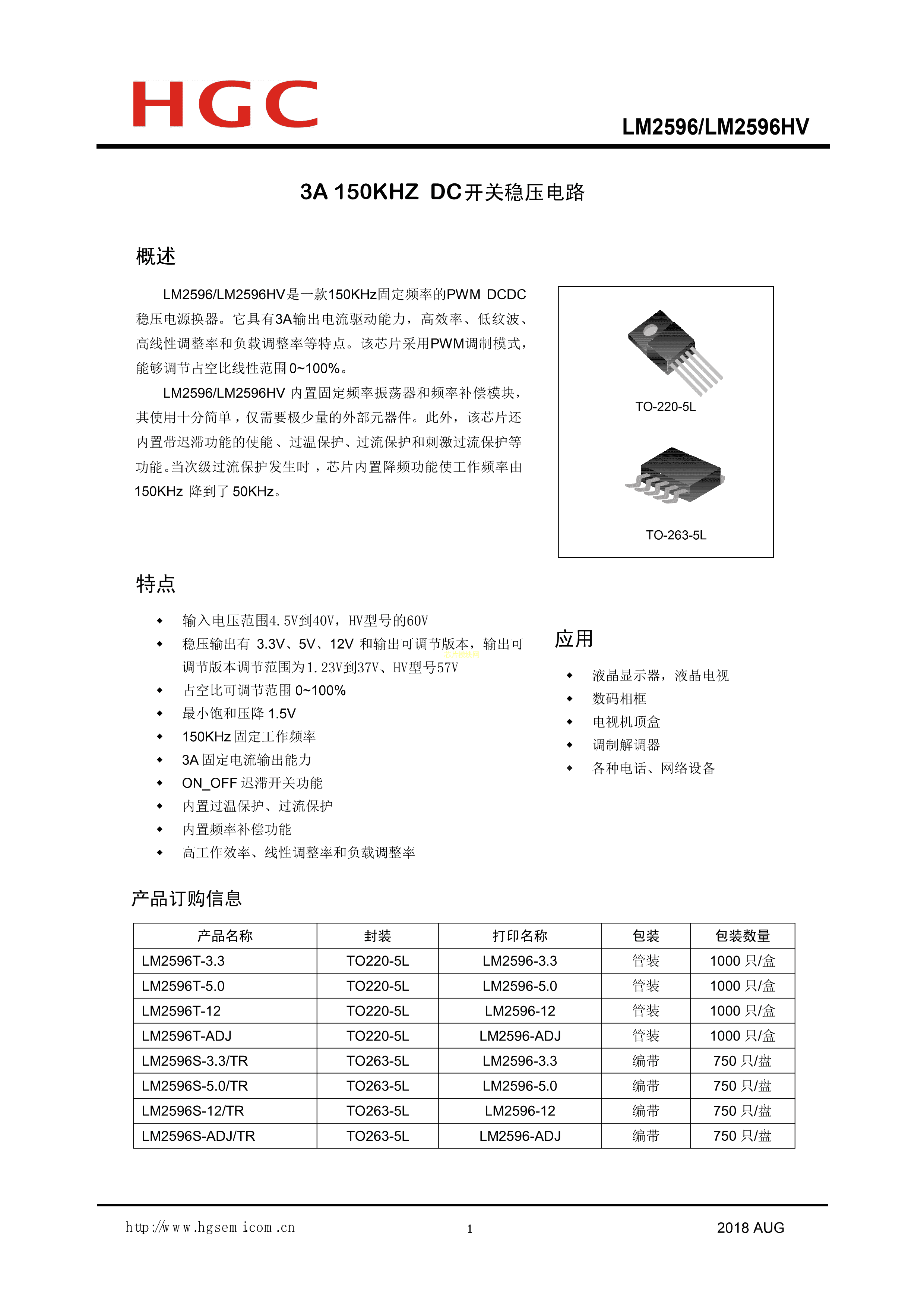 LM2596T-ADJ数据手册TO-220封装HGC(华冠)PDF规格书,中英文下载