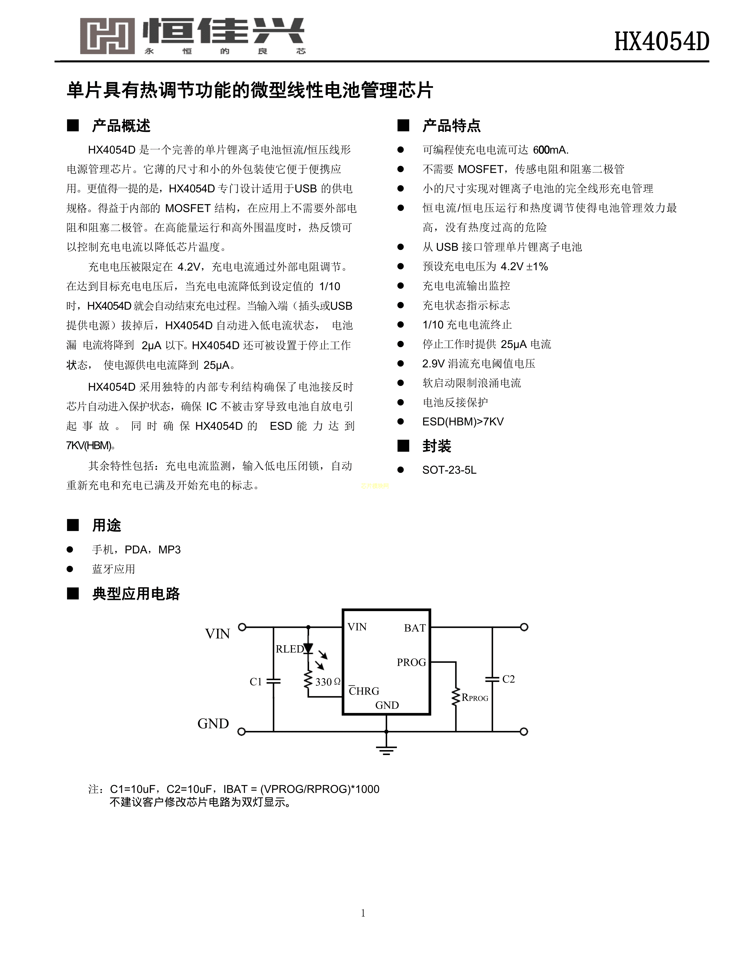 HX4054D数据手册SOT-23-5封装HX(恒佳兴)PDF规格书,中英文下载