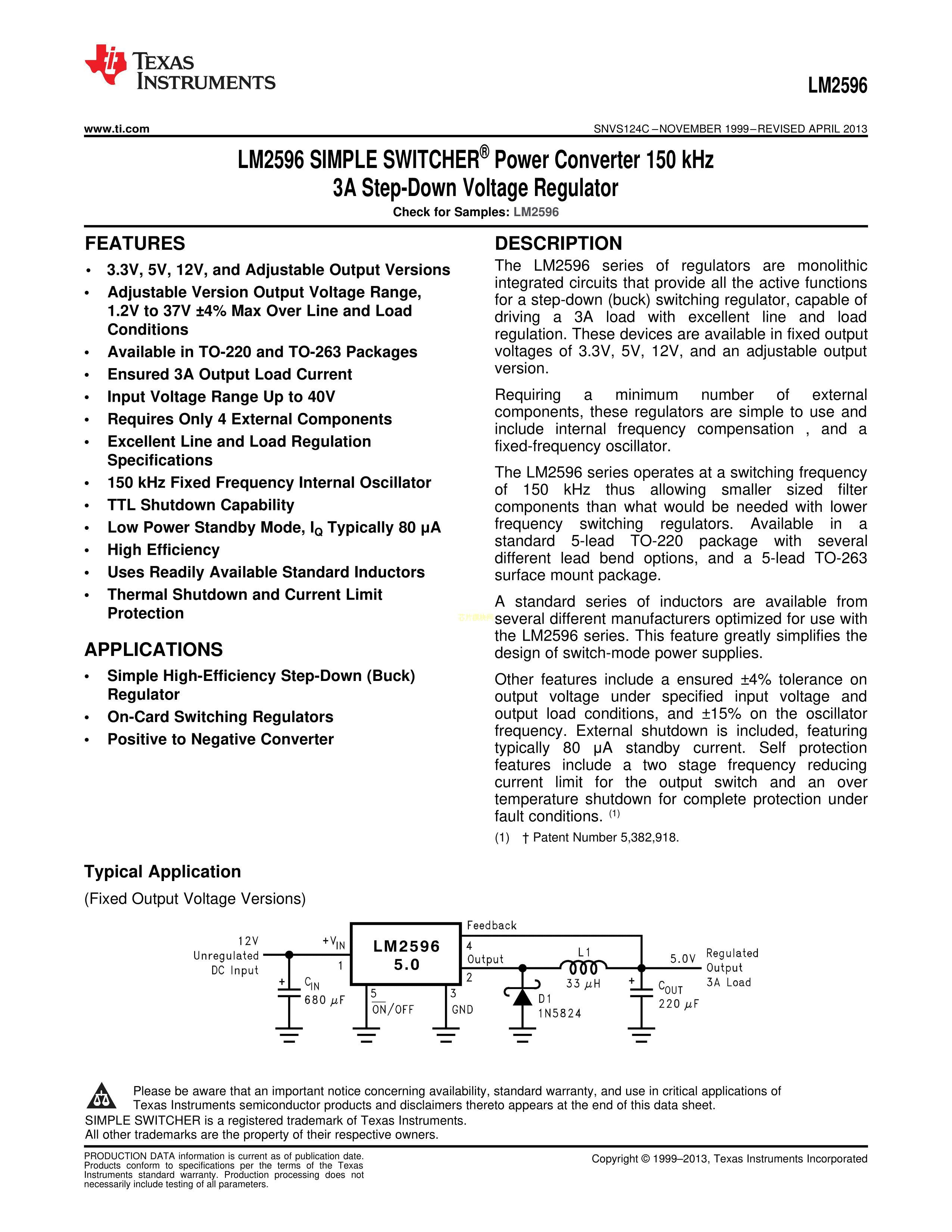 LM2596T-3.3数据手册TO-220-5(Forming)封装TI(德州仪器)PDF规格书,中