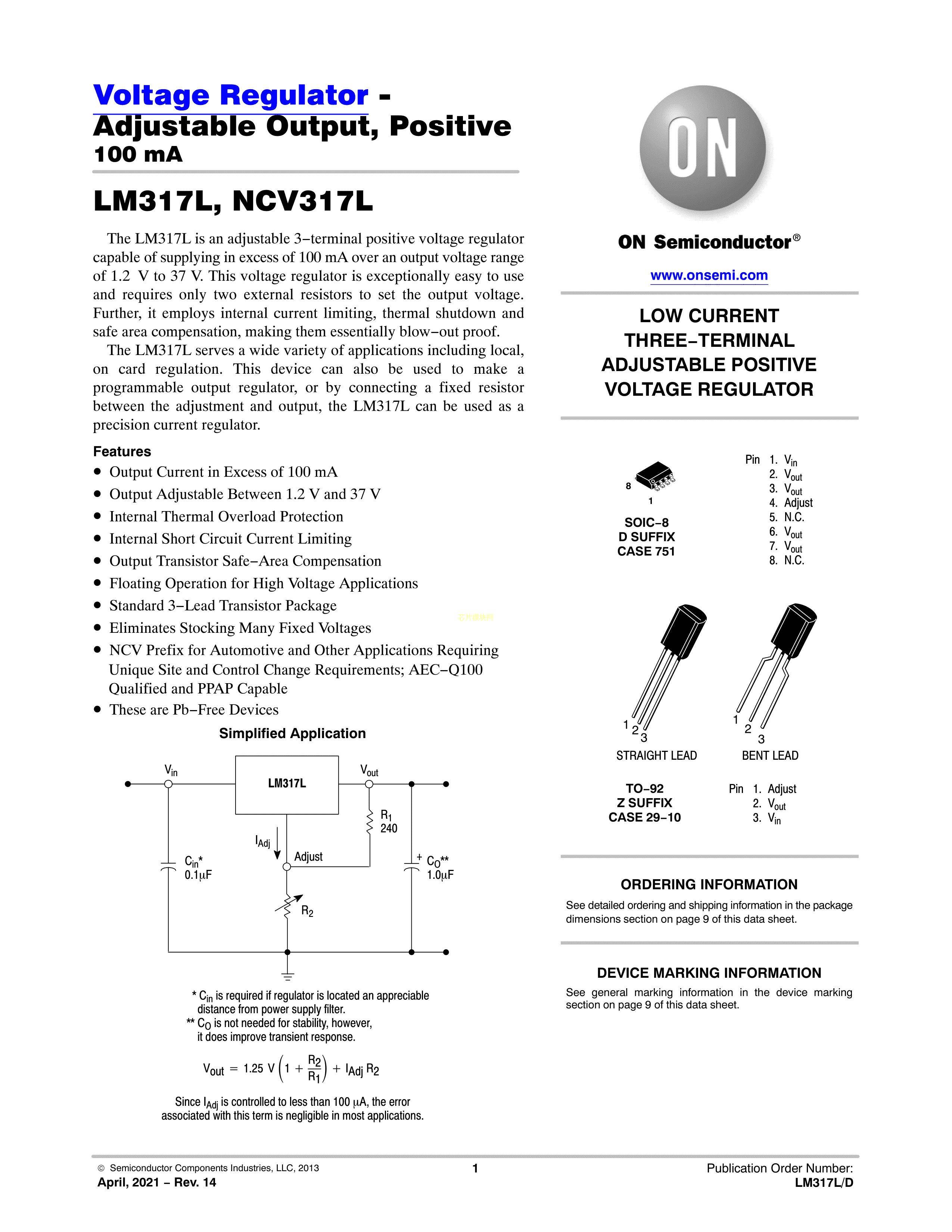 LM317LZREG数据手册TO-92封装onsemi(安森美)PDF规格书,中英文下载