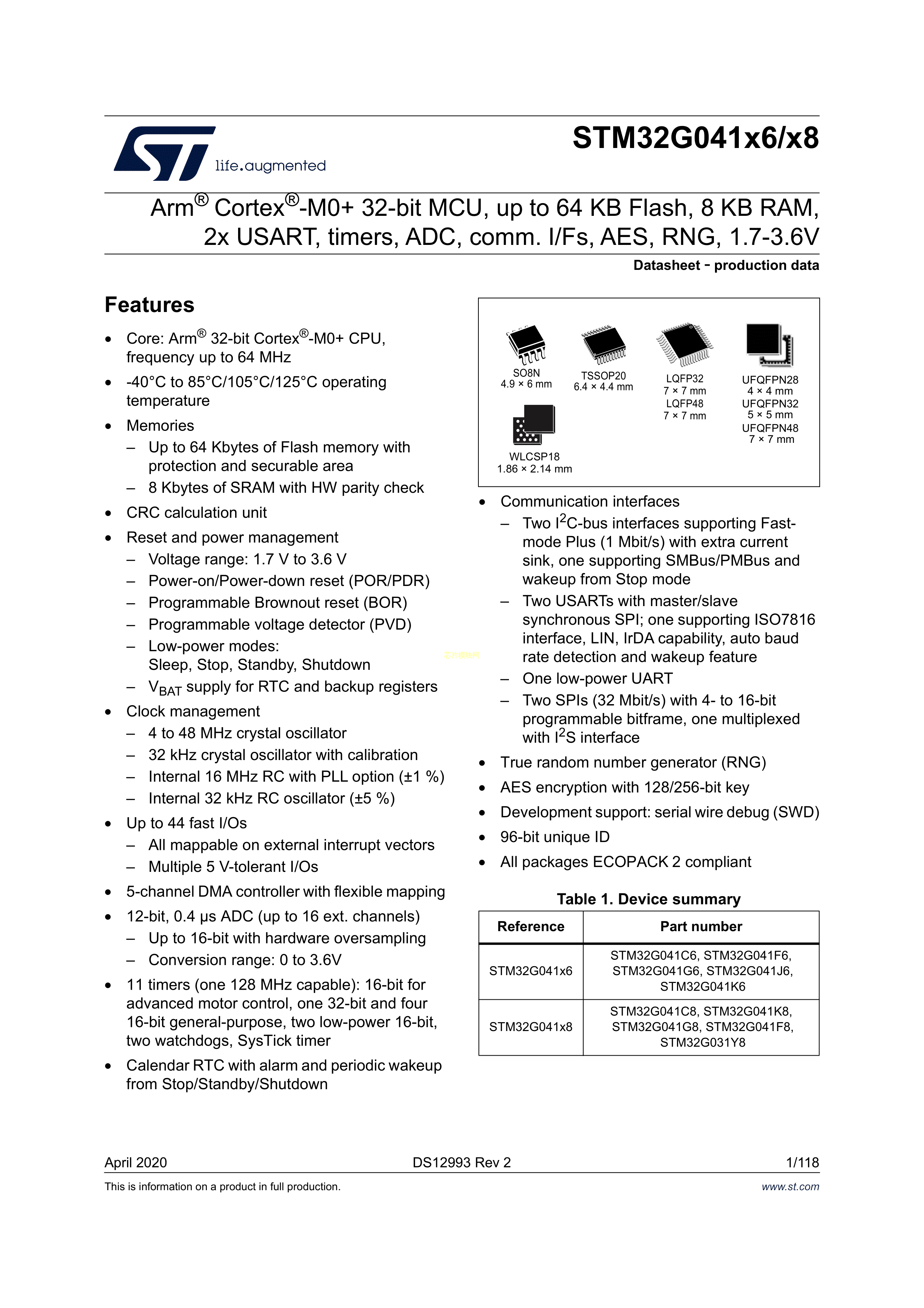 STM32G041Y8Y6TR数据手册WLCSP-18封装ST(意法半导体)PDF规格书,中英文下载
