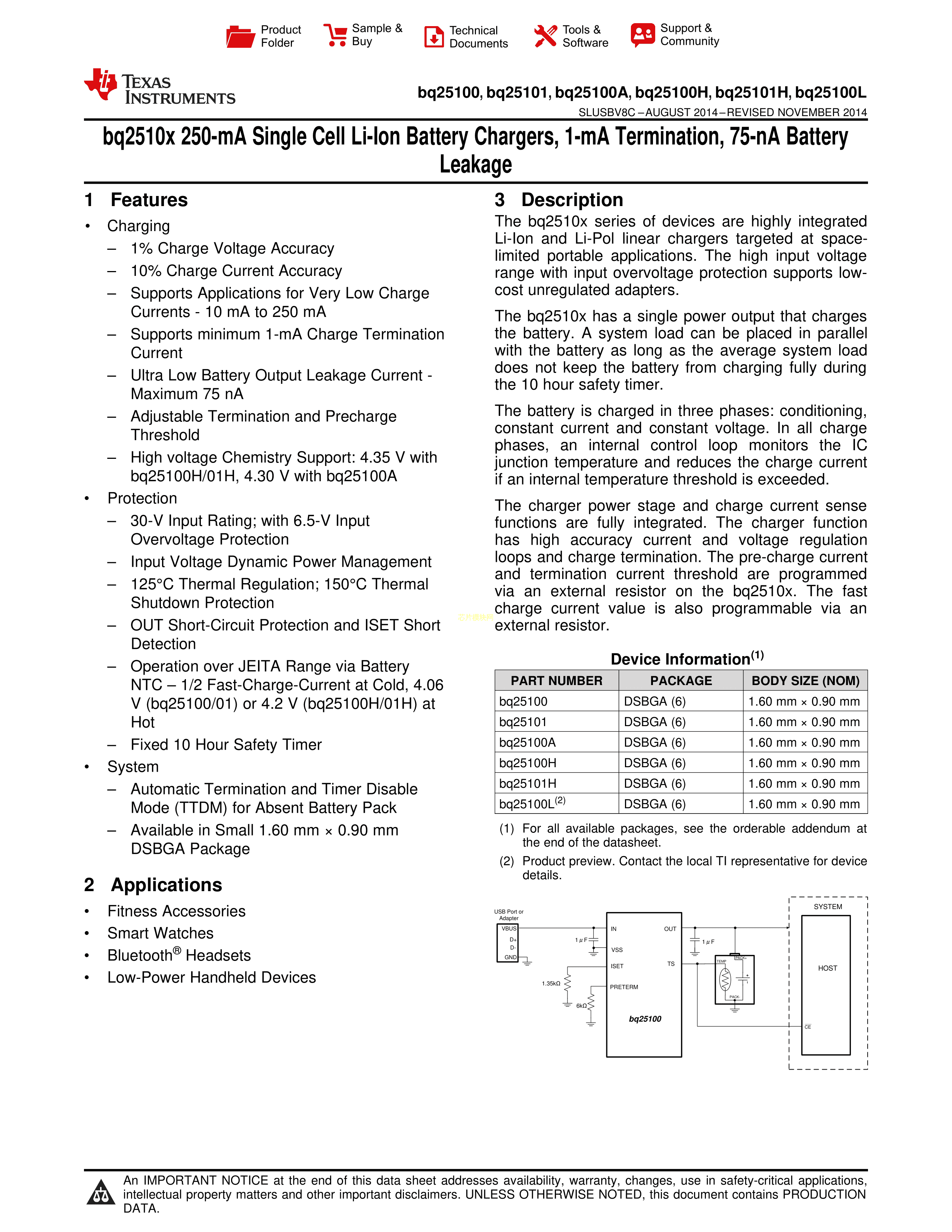 BQ25101YFPR数据手册DSBGA-6封装TI(德州仪器)PDF规格书,中英文下载