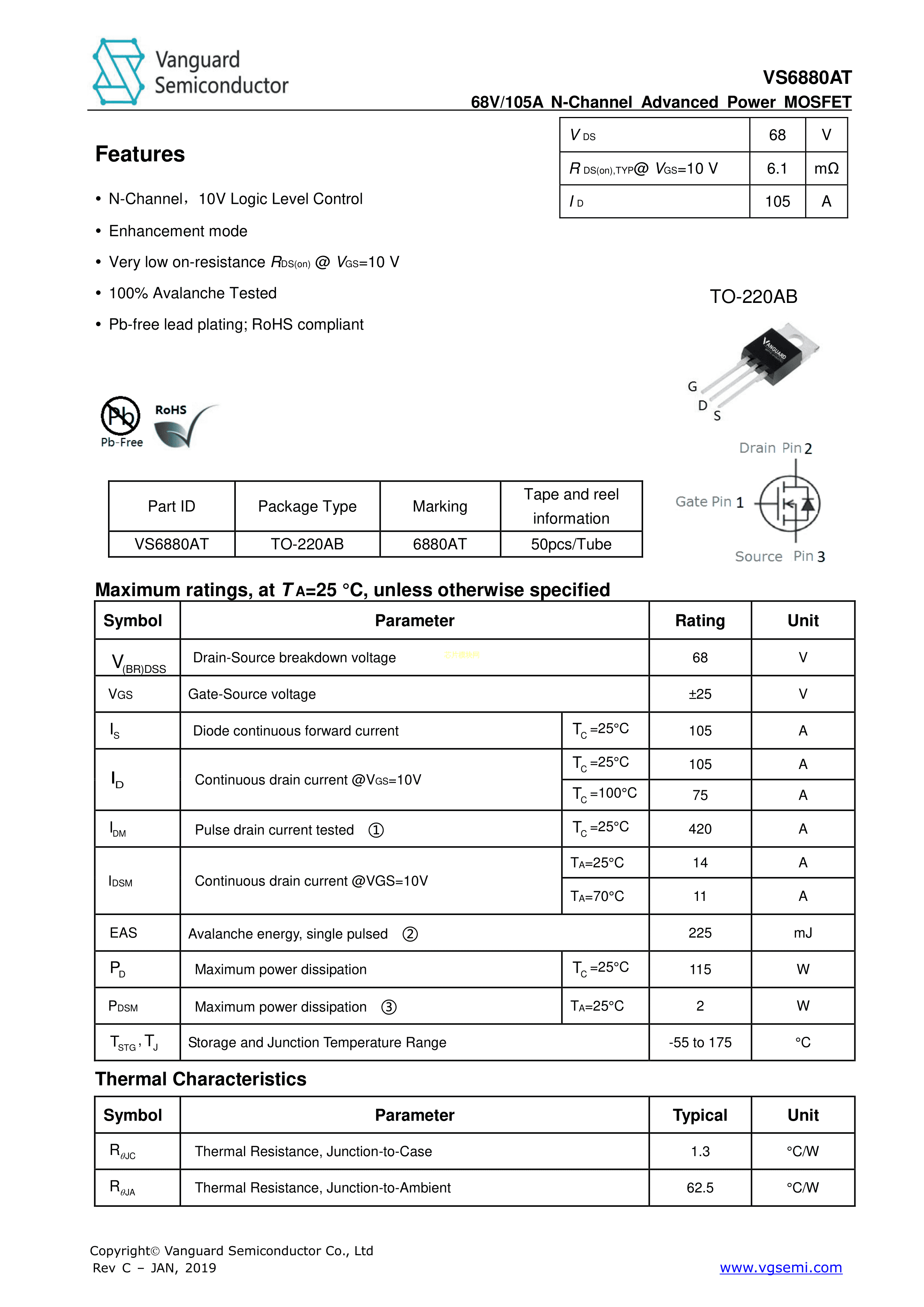 VS6880AT数据手册TO-220AB封装Vanguard(威兆)PDF规格书,中英文下载