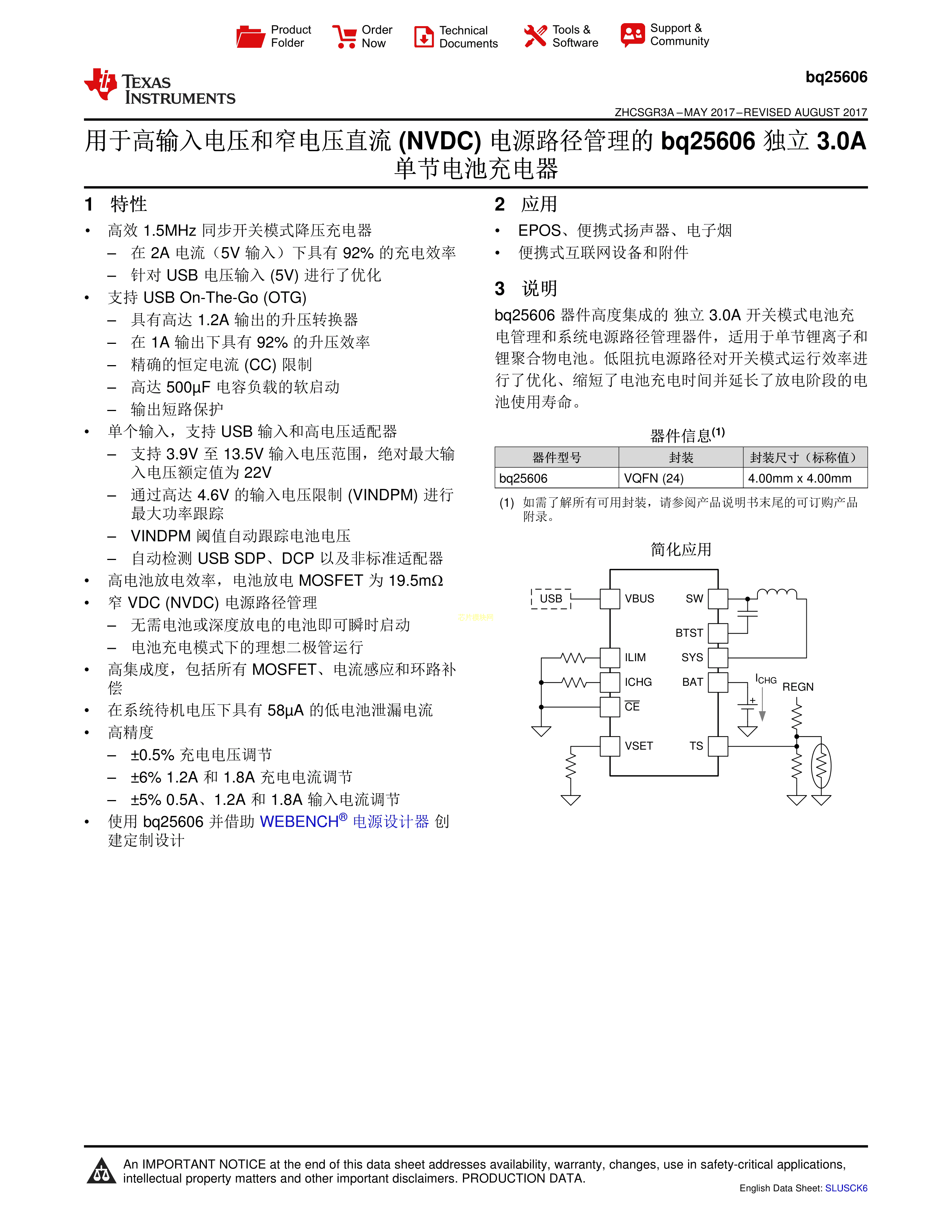 BQ25606RGER数据手册VQFN-24封装TI(德州仪器)PDF规格书,中英文下载