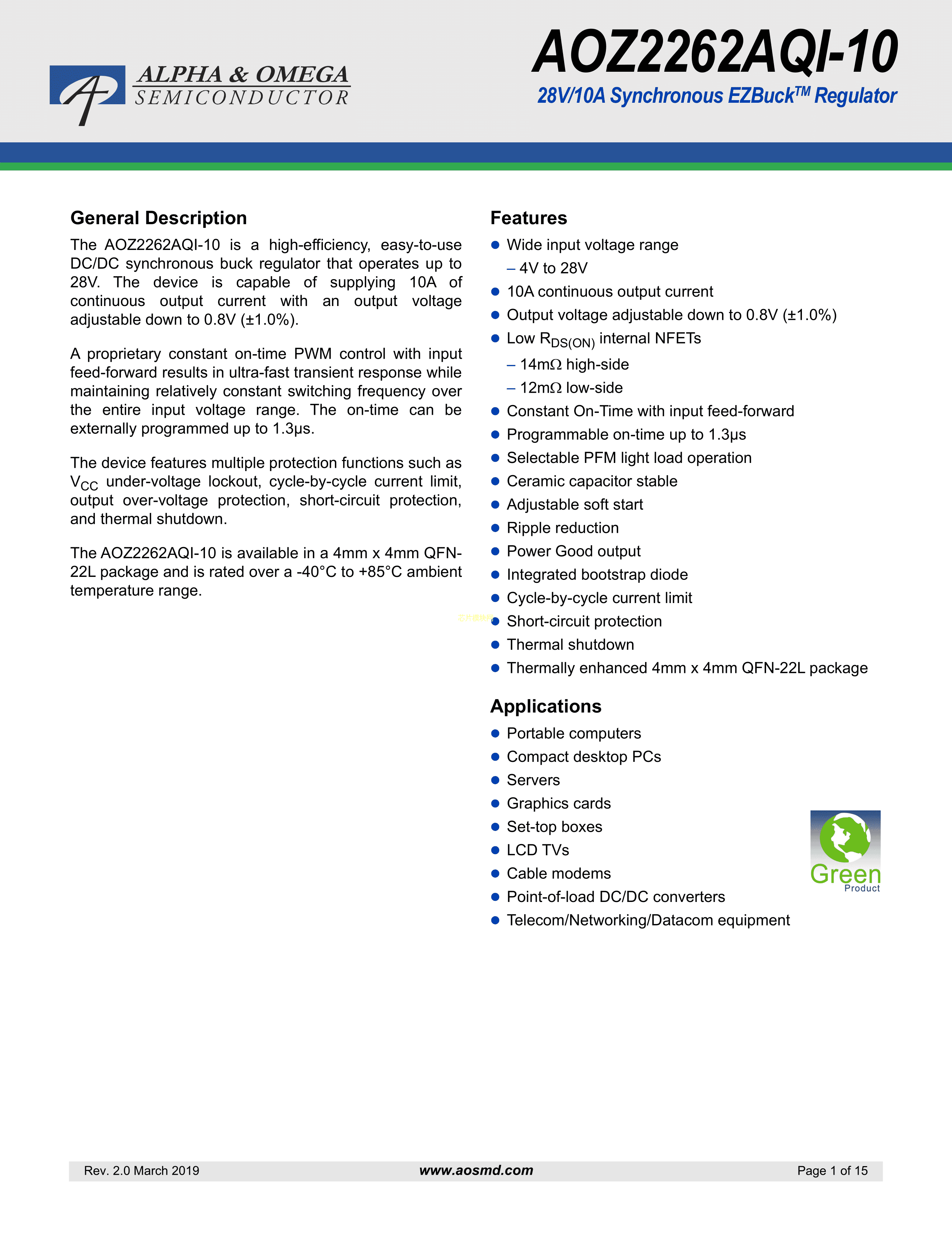 AOZ2262AQI-10数据手册QFN-22(4x4)封装AOSPDF规格书,中英文下载