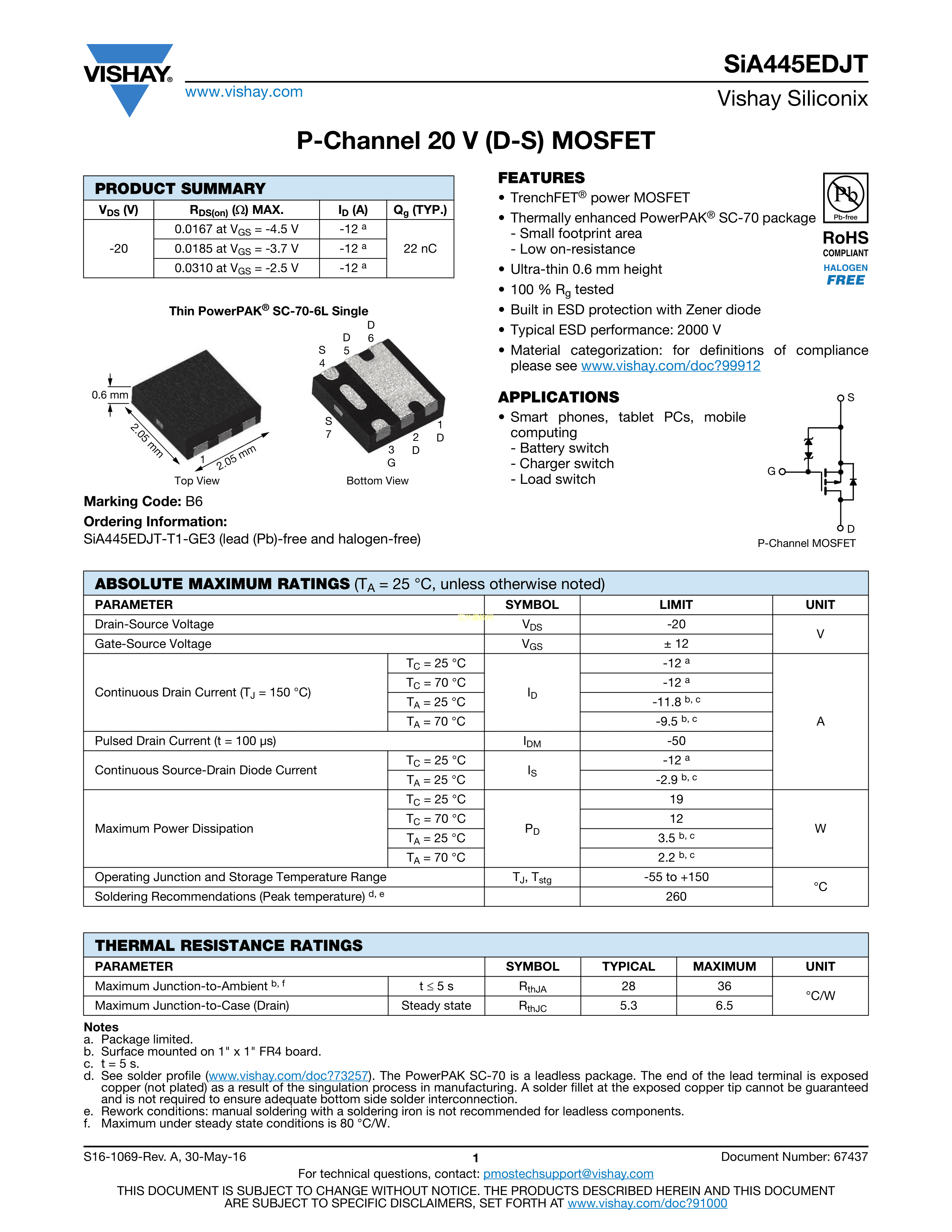 SIA445EDJT-T1-GE3数据手册PowerPAK SC-70-6L封装VISHAY(威世)