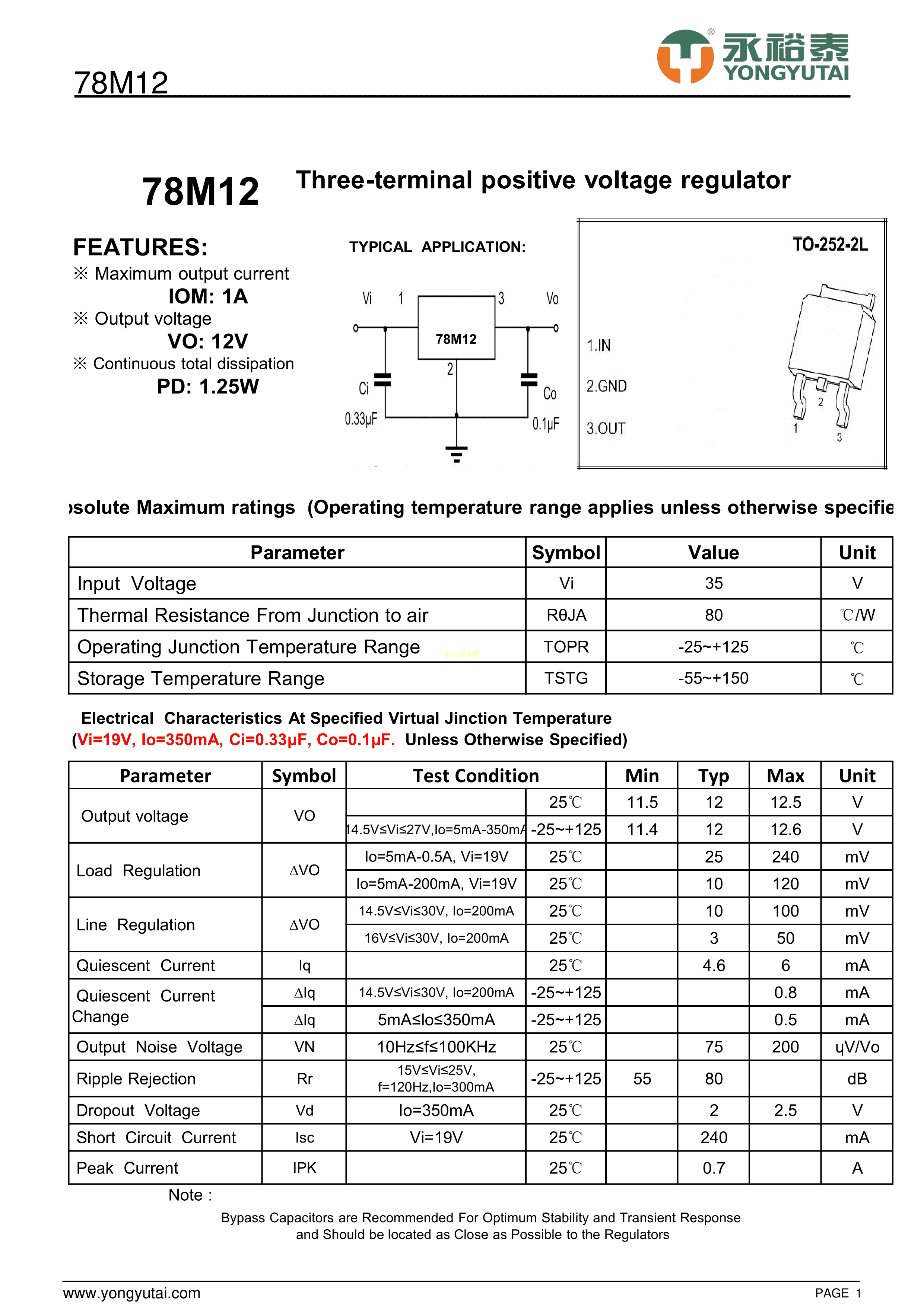 78M12数据手册TO-252-2封装YONGYUTAI(永裕泰)PDF规格书,中英文下载