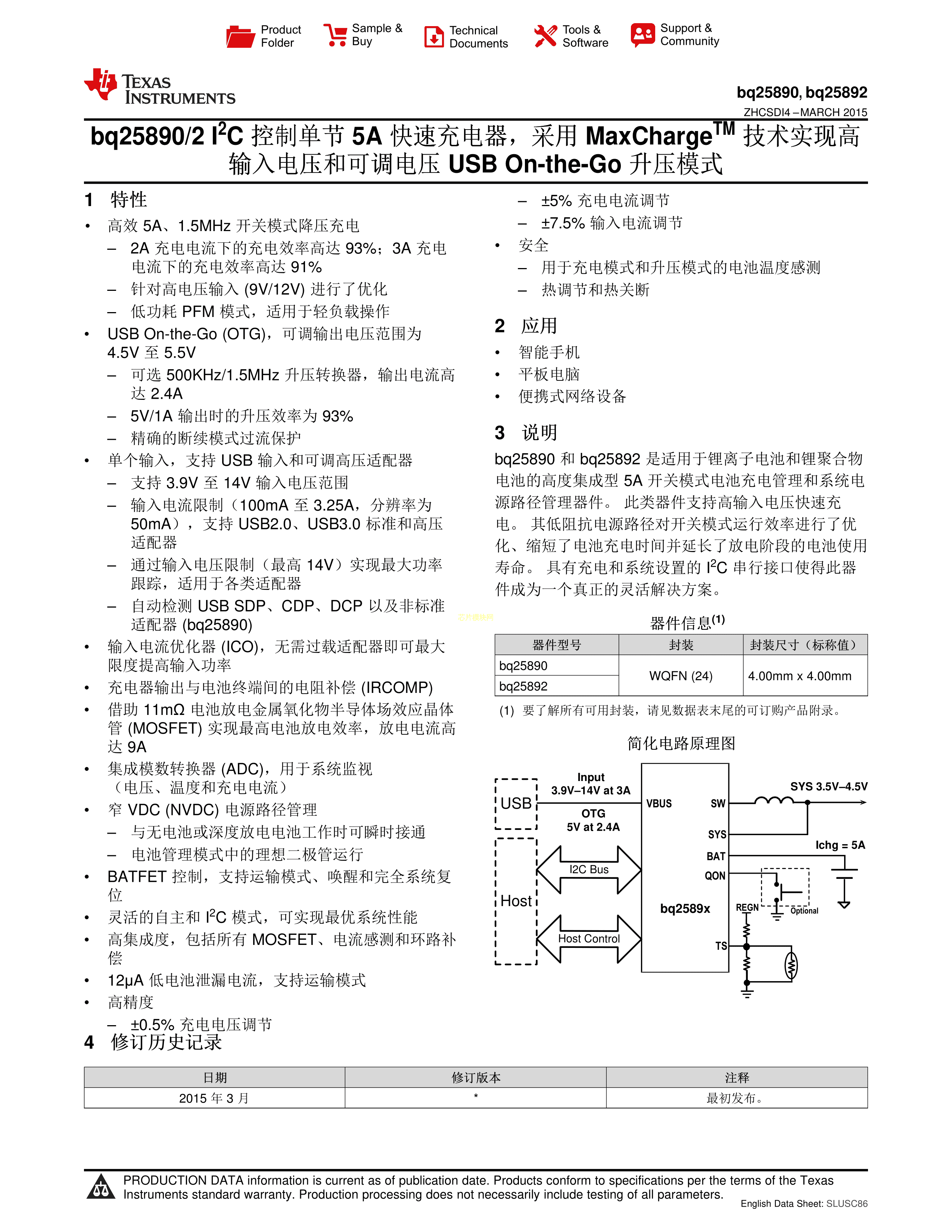 BQ25890RTWR数据手册WQFN-24封装TI(德州仪器)PDF规格书,中英文下载