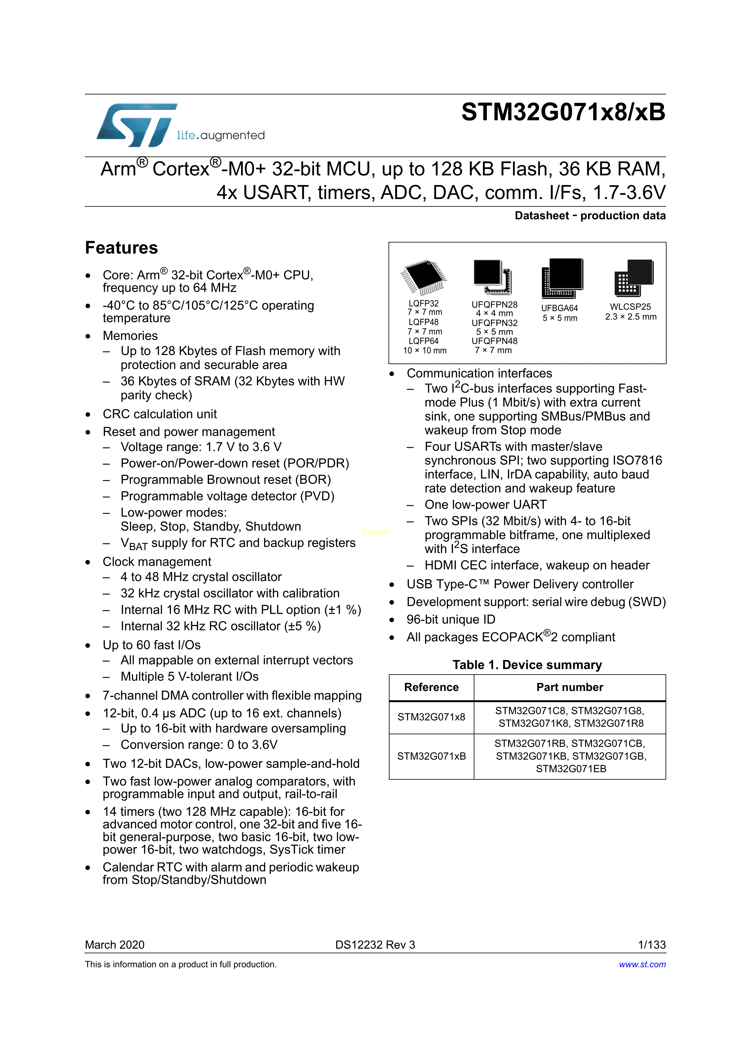 STM32G071KBT3数据手册LQFP-32封装ST(意法半导体)PDF规格书,中英文下载