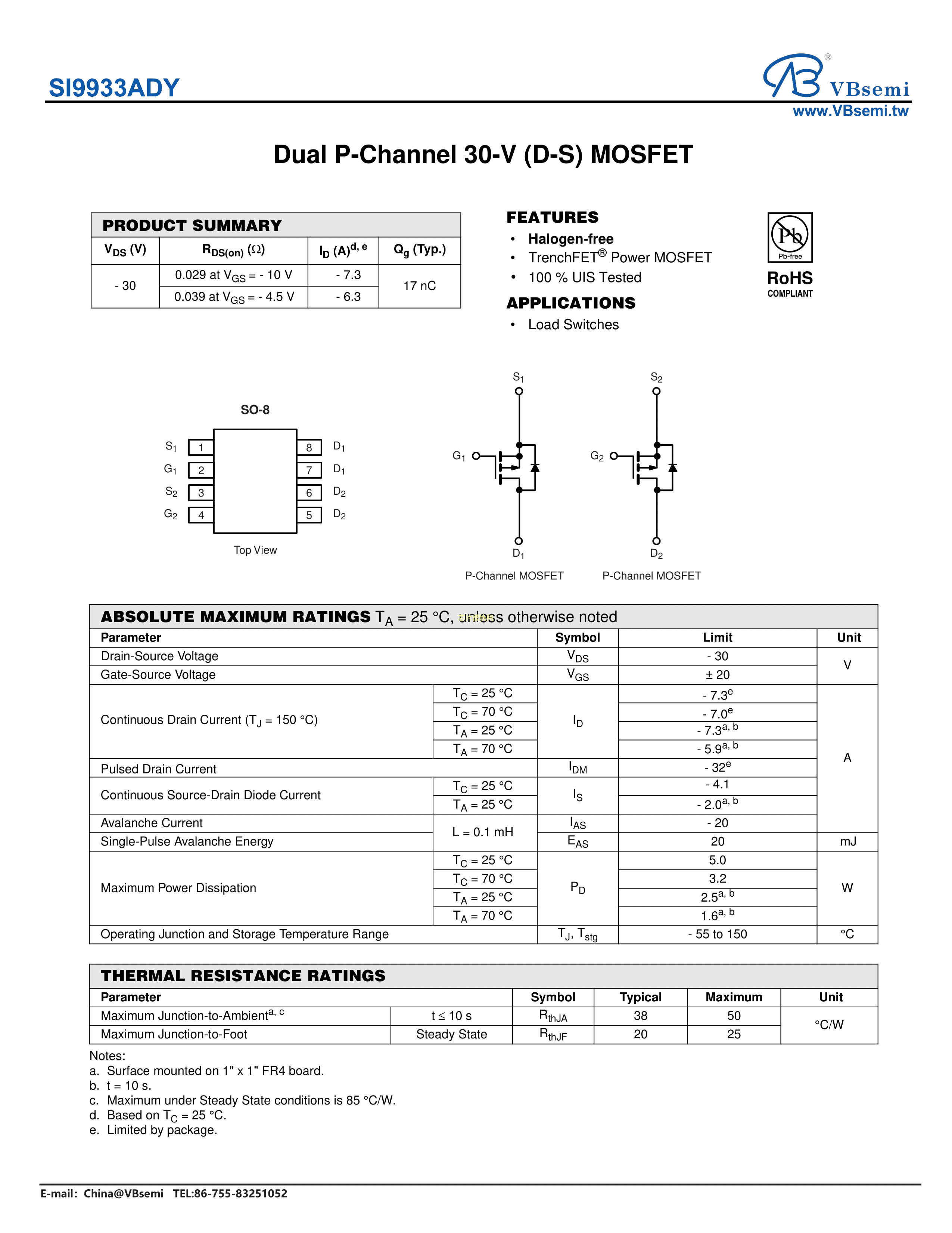 SI9933ADY数据手册SO-8封装VBsemi(台湾微碧)PDF规格书,中英文下载