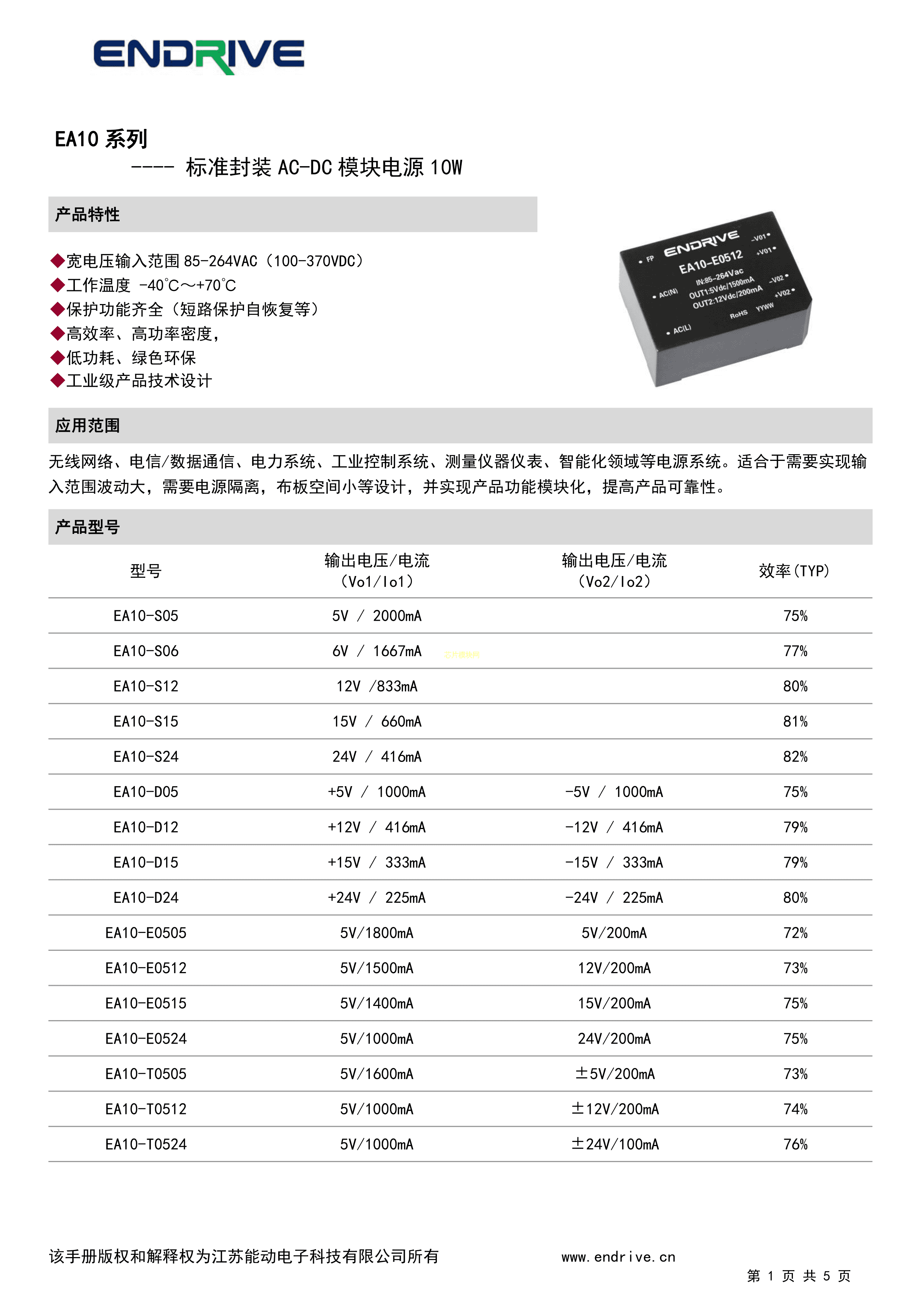 EA10-48E0505数据手册插件封装ENDRIVE(江苏能动)PDF规格书,中英文下载