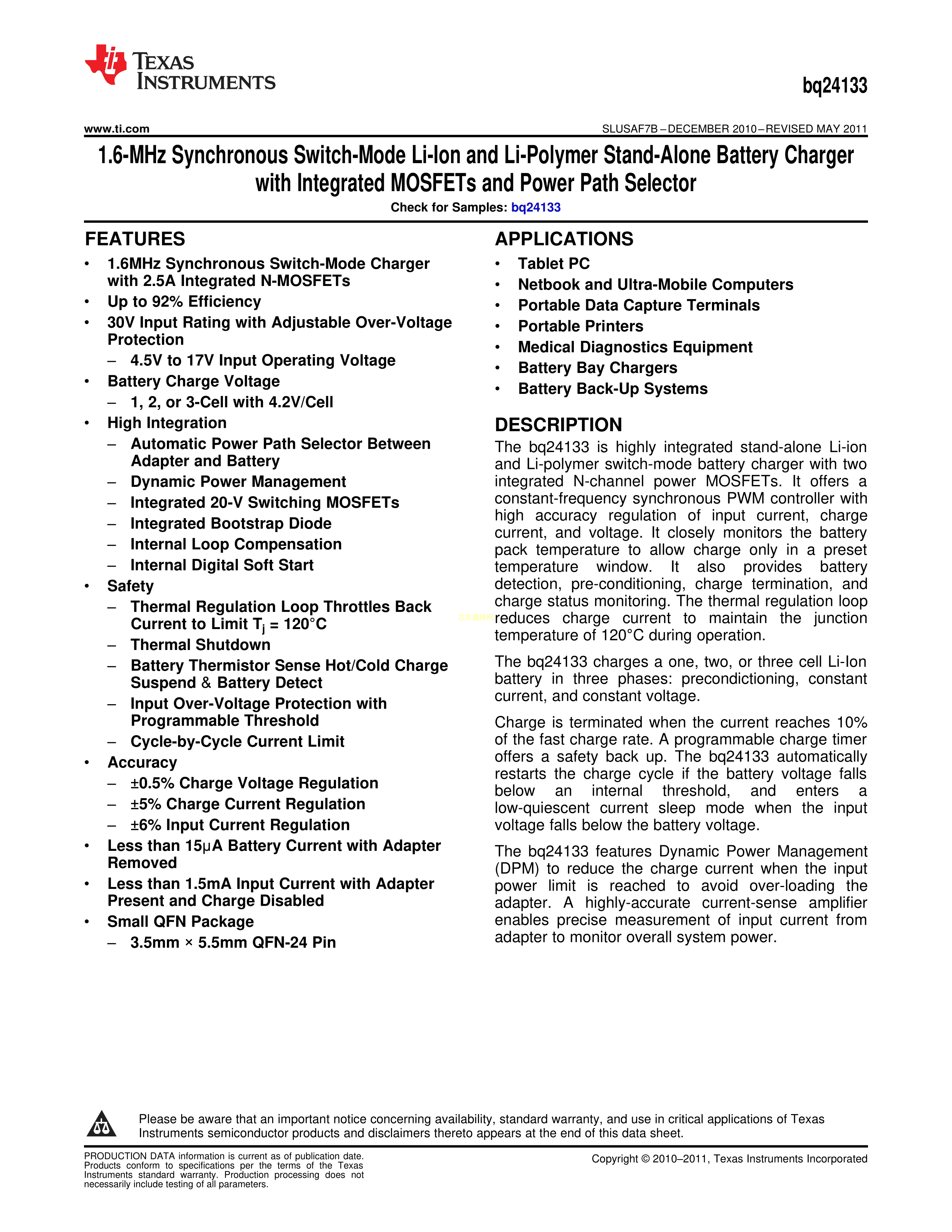 BQ24133RGYR数据手册VQFN-24_3.5x5.5x05P封装TI(德州仪器)PDF规格书