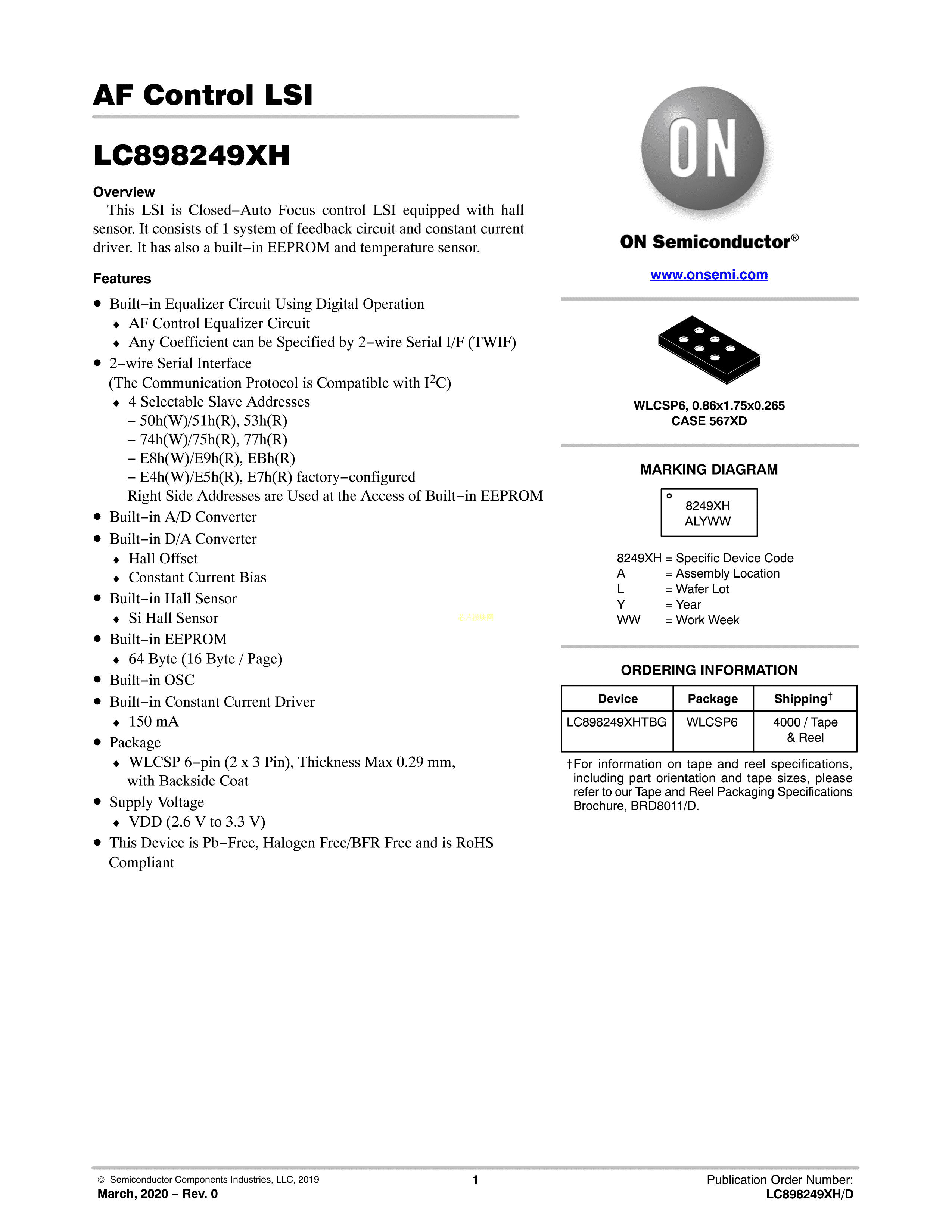 LC898249XHTBG数据手册WLCSP6封装onsemi(安森美)PDF规格书,中英文下载