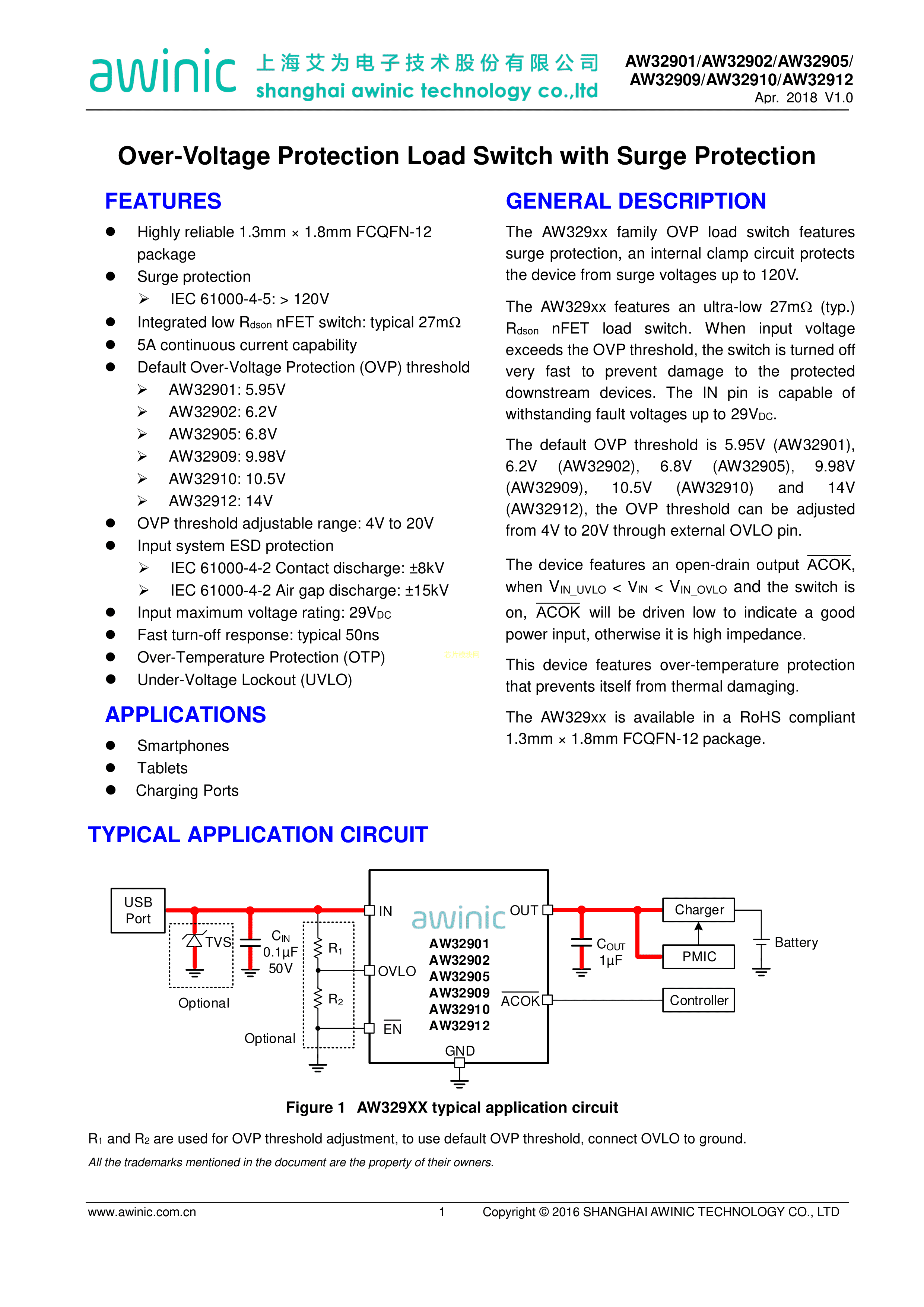 AW32901FCR数据手册FCQFN-12(1.3x1.8)封装AWINIC(艾为)PDF规格书,