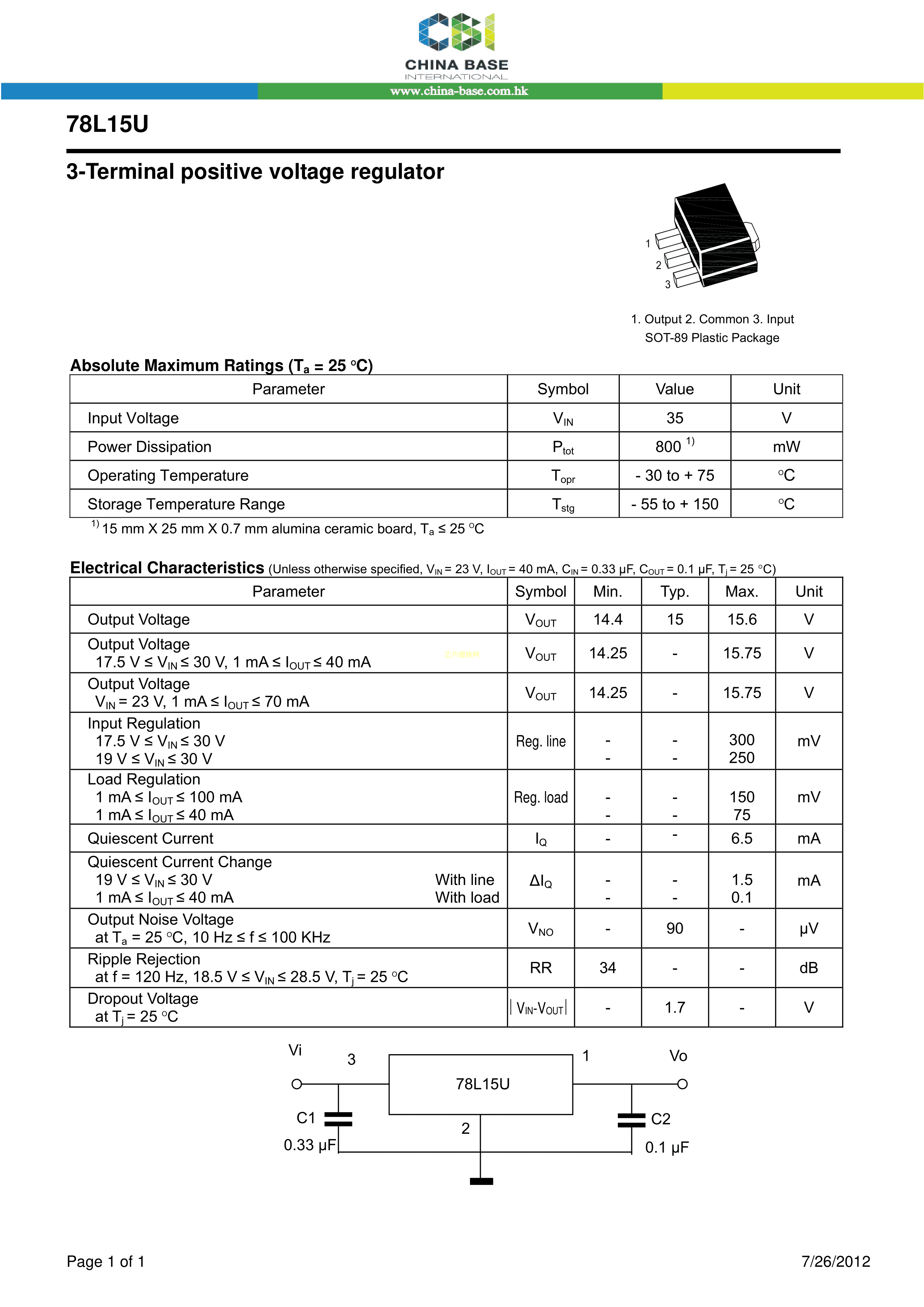 78L15U 78L15数据手册SOT-89封装CBI(创基)PDF规格书,中英文下载
