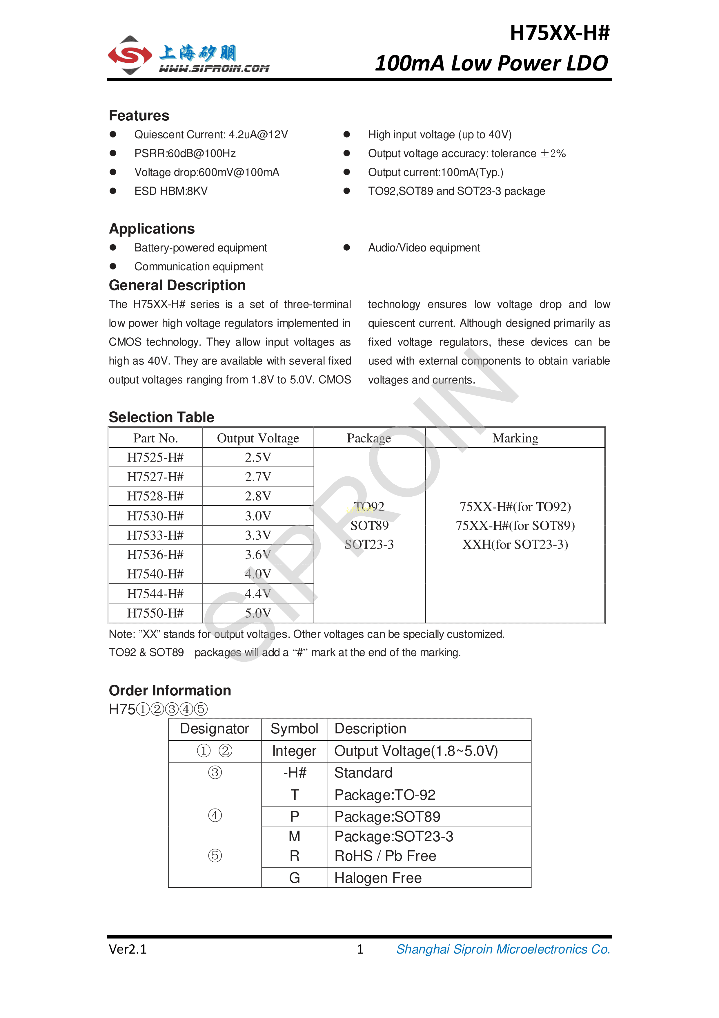 H7536-H#数据手册SOT-89封装Siproin(上海矽朋)PDF规格书,中英文下载