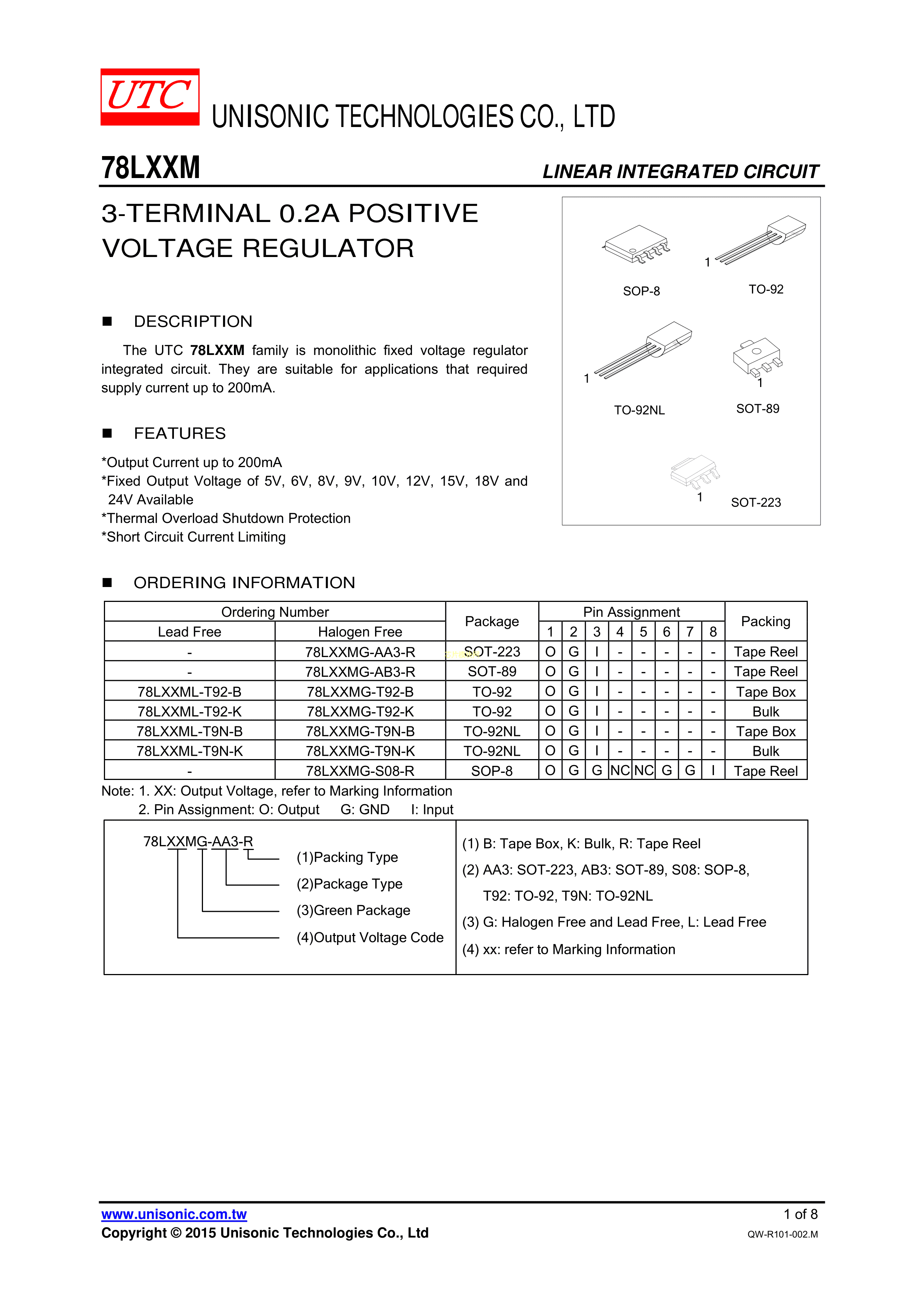 78L15L-T92-B数据手册TO-92_Forming1封装UTC(友顺)PDF规格书,中英文下
