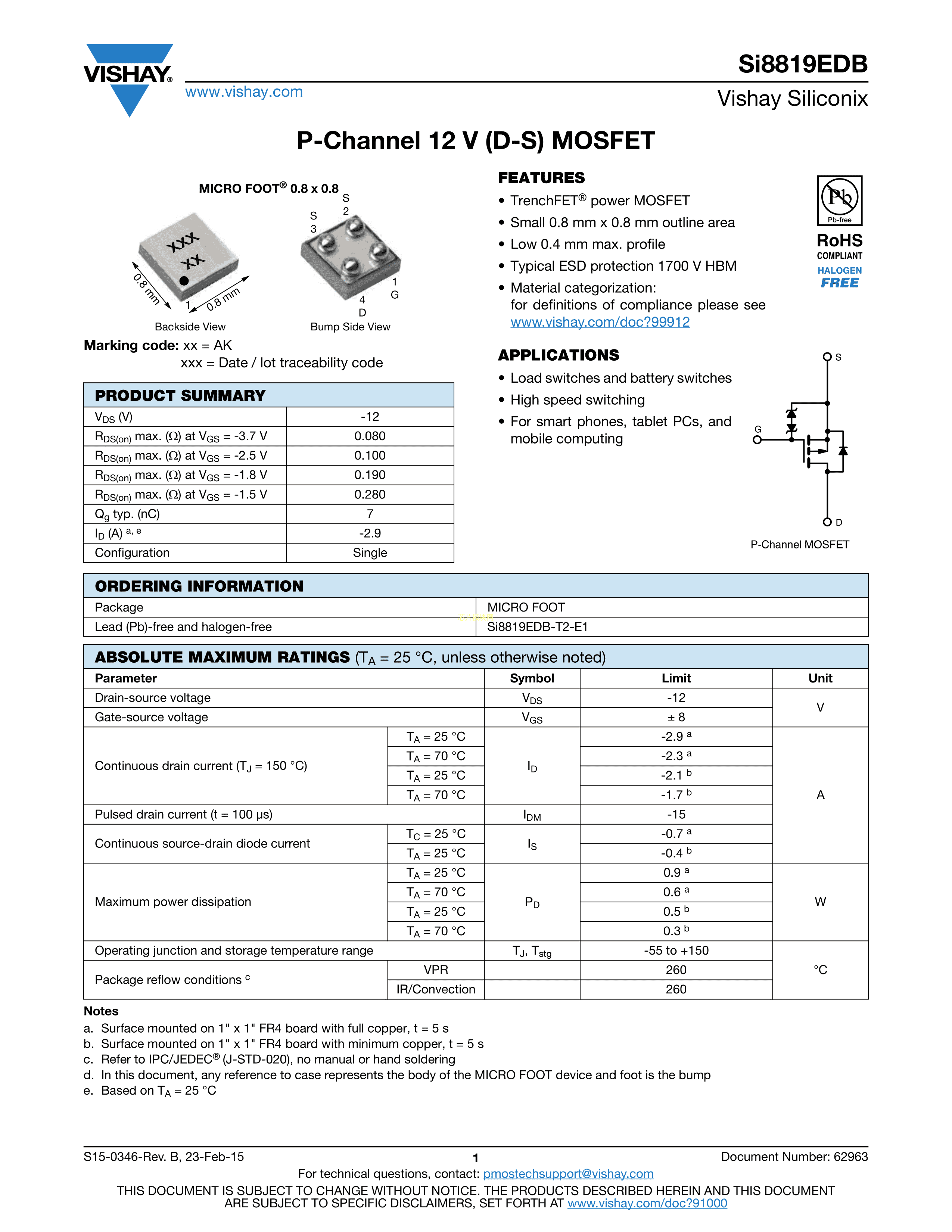 SI8819EDB-T2-E1数据手册MicroFoot-4封装VISHAY(威世)PDF规格书,中