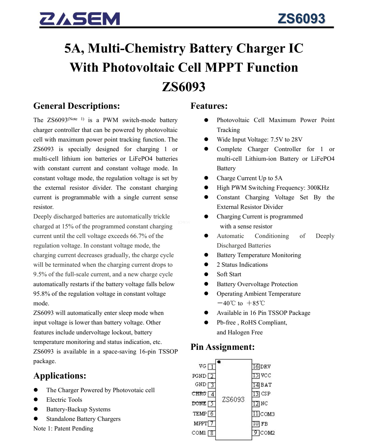 ZS6093,5A多化学电池充电器,具有光伏电池MPPT功能芯片PDF规格书下载