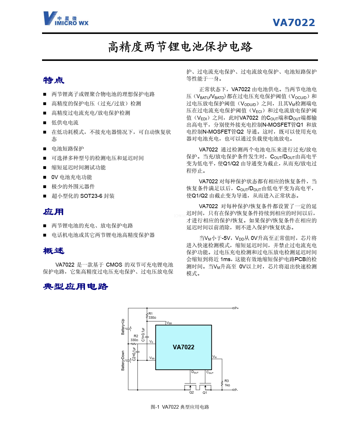 VA7022,高精度两节锂电池保护电路芯片PDF规格书下载