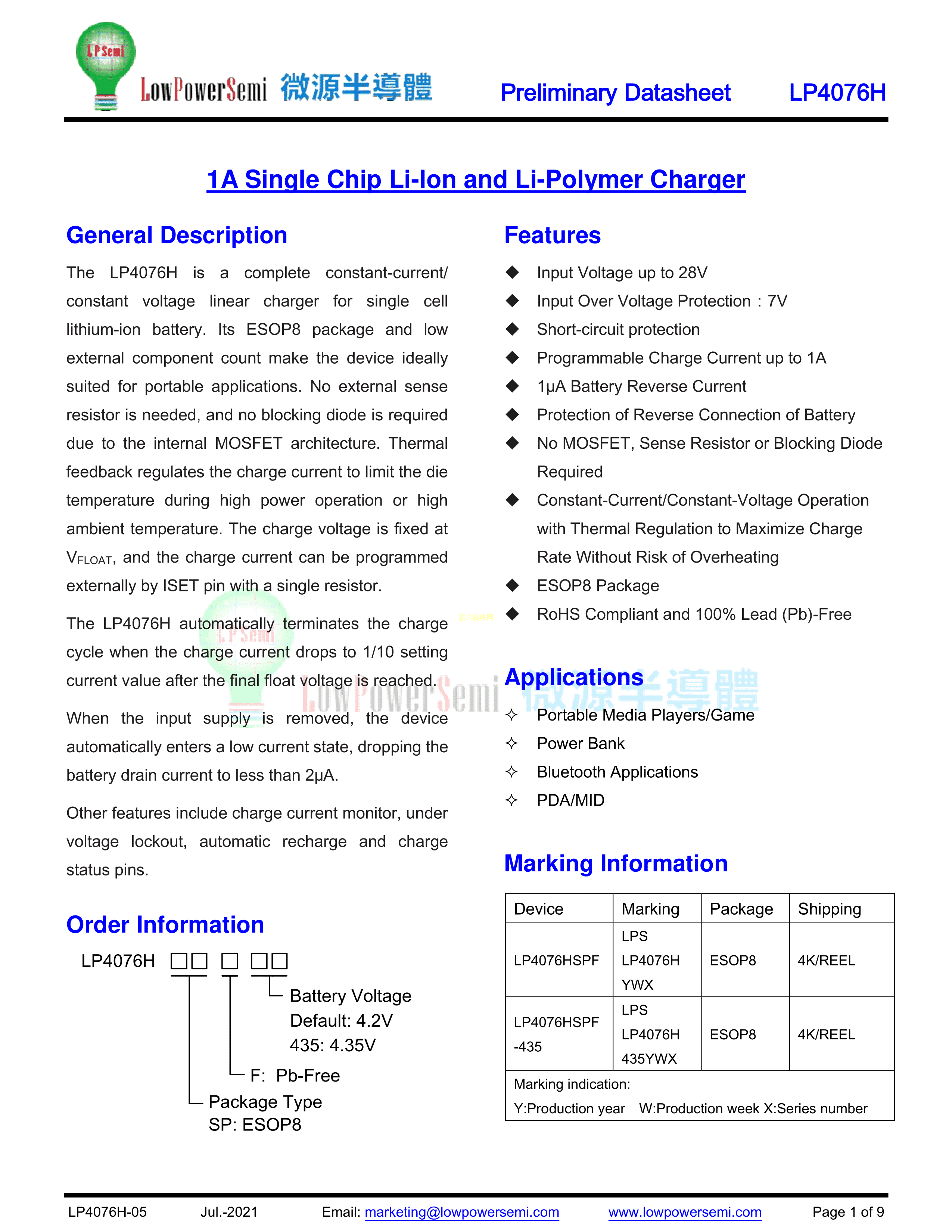 LP4076HSPF-435数据手册ESOP-8封装LOWPOWER(微源半导体)PDF规格书,中英文下载