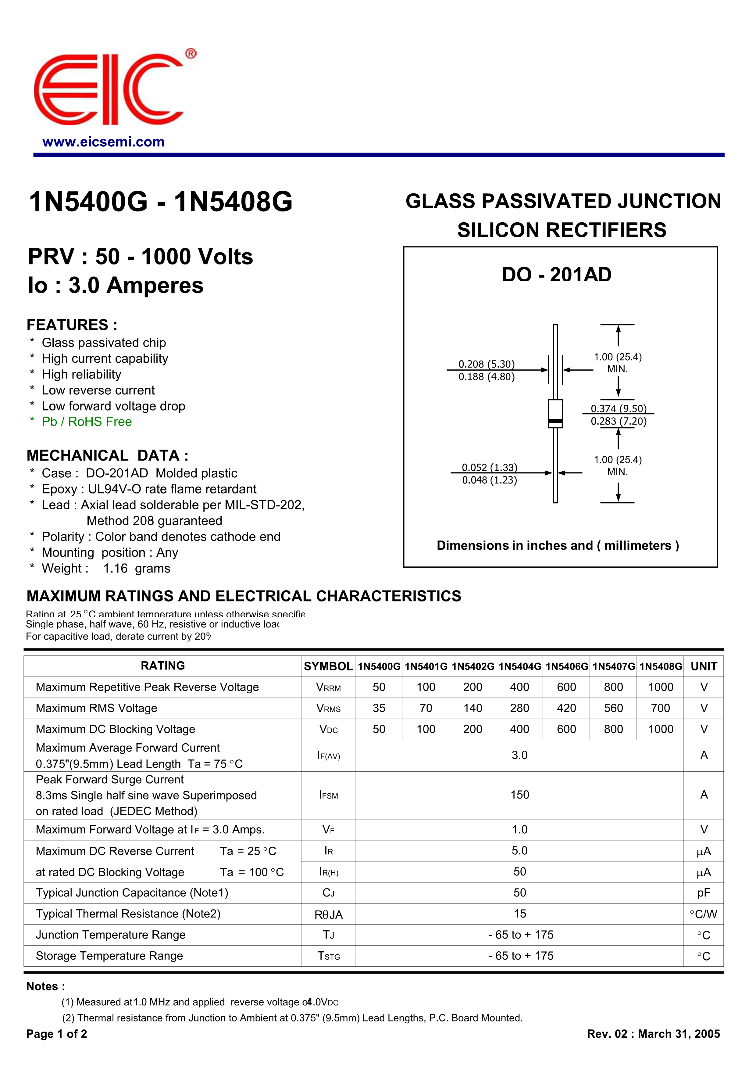 1N5404G数据手册DO-201AD封装EICPDF规格书,中英文下载