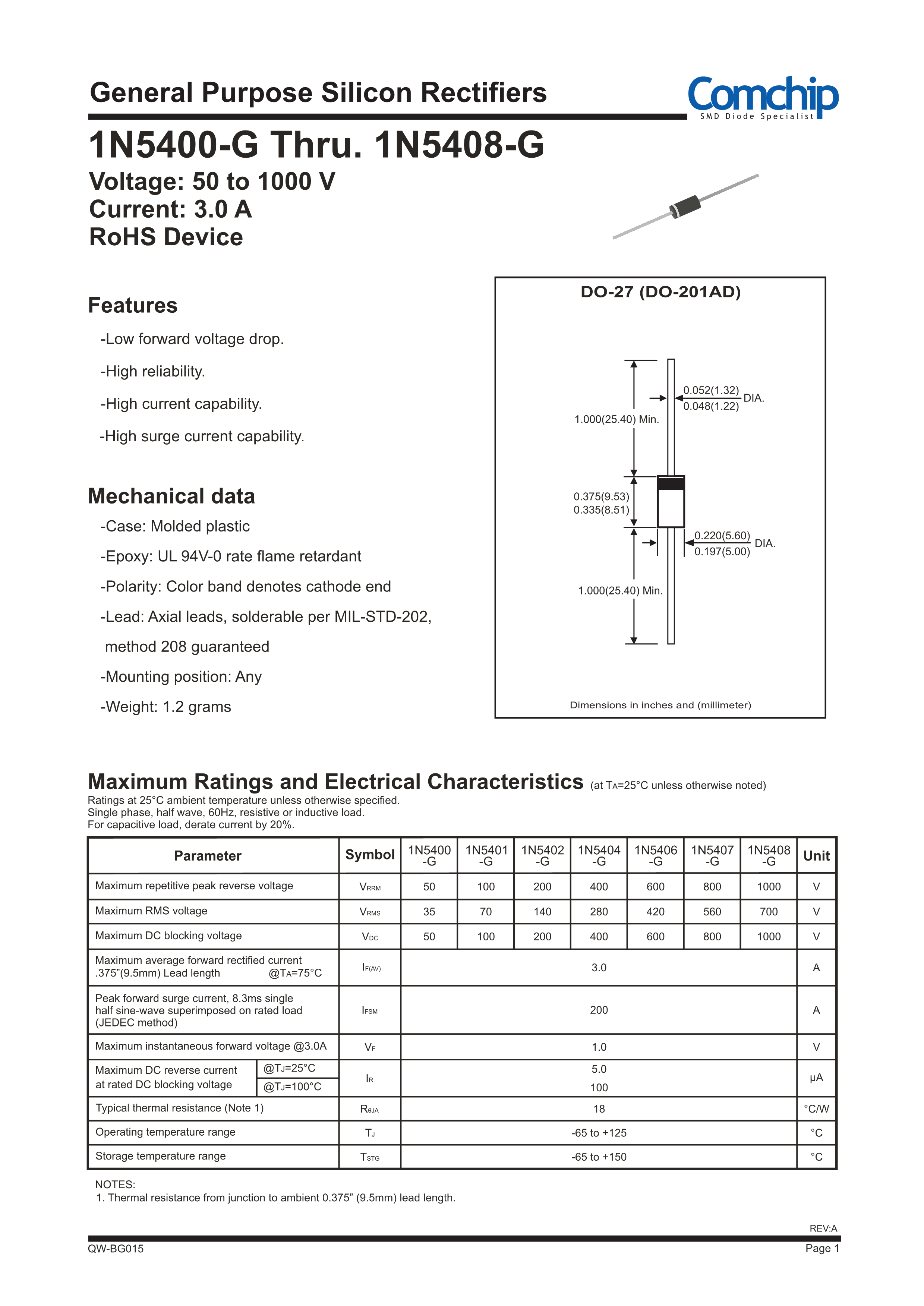 1N5406数据手册DO-201AD封装GOOD-ARK(固锝)PDF规格书,中英文下载