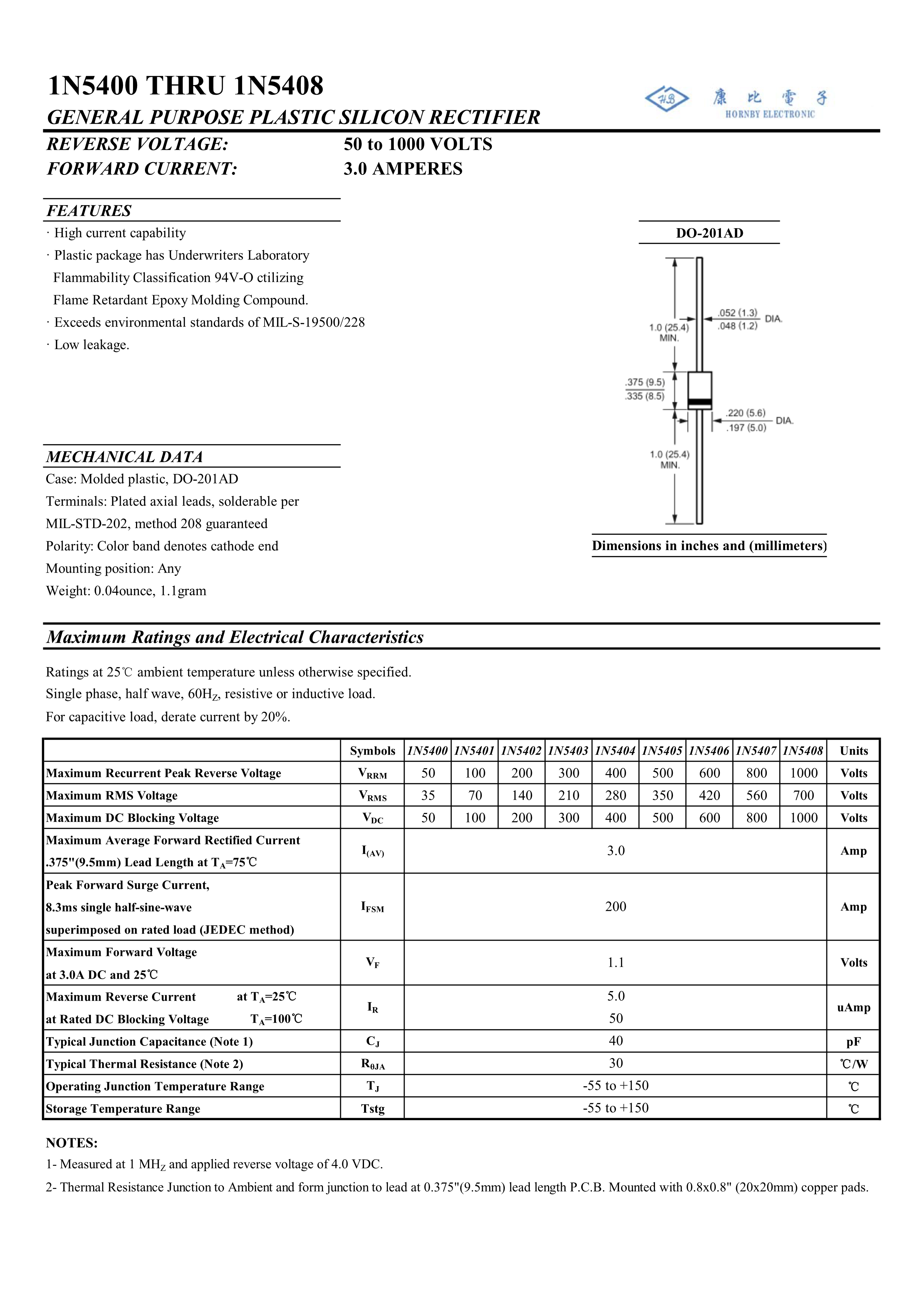 1N5404数据手册DO-201AD封装HORNBY ELECTRONIC(南通康比)PDF规格书,