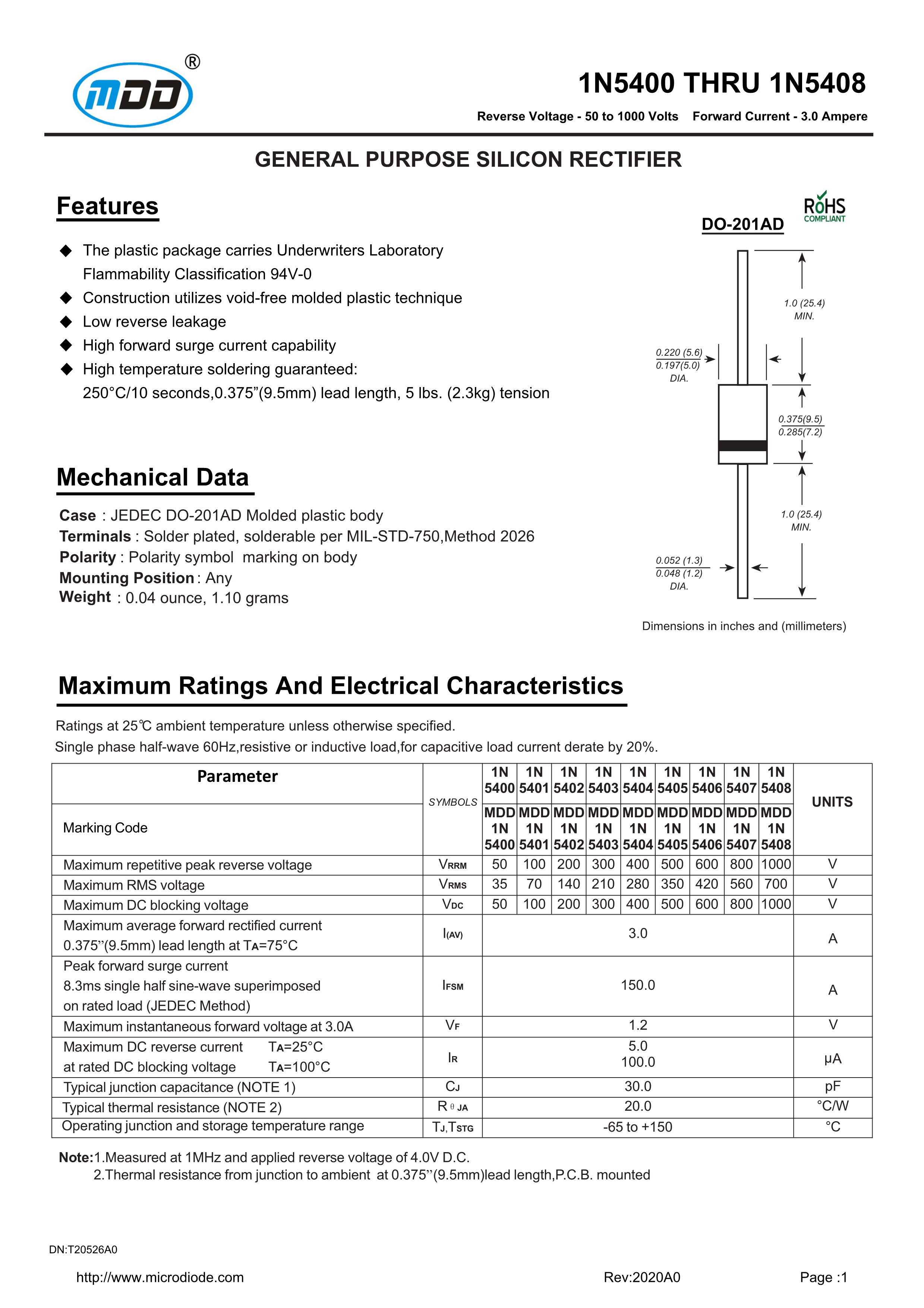 1N5404数据手册DO-201AD封装MDDPDF规格书,中英文下载