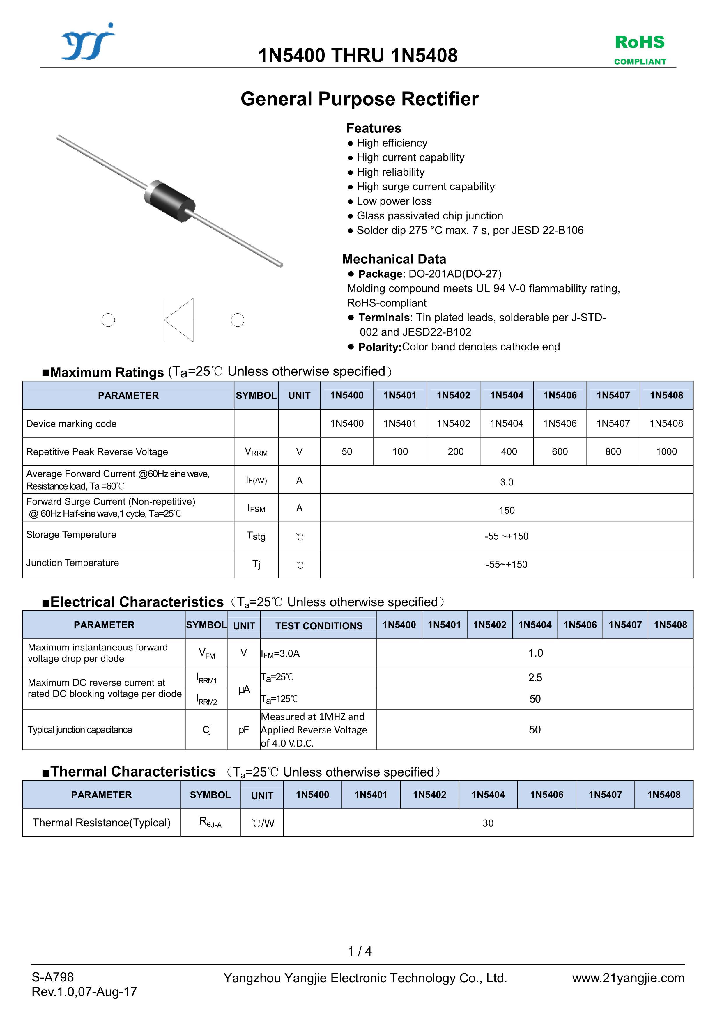 1N5406数据手册DO-201AD封装YANGJIE(扬杰)PDF规格书,中英文下载
