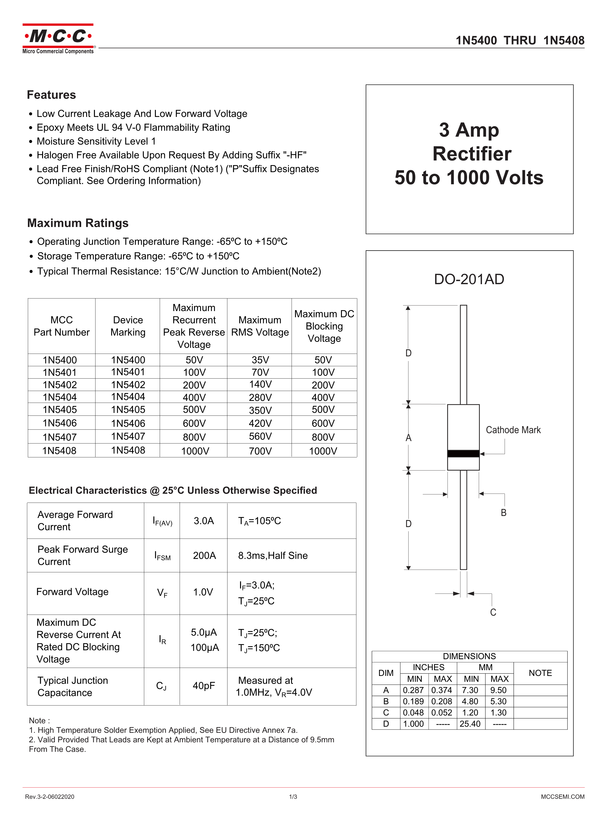 1N5404-TP数据手册DO-201AD封装MCC(美微科)PDF规格书,中英文下载